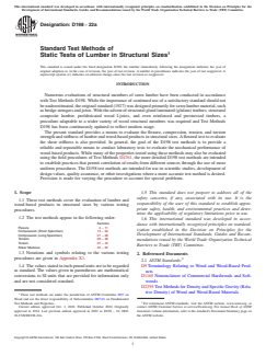ASTM D198-22a is a standard published by ASTM International. Its full title is "Standard Test Methods of Static Tests of Lumber in Structural Sizes". This standard covers: SIGNIFICANCE AND USE 6.1 The flexural properties established by this test method provide: 6.1.1 Data for use in development of grading rules and specifications; 6.1.2 Data for use in development of design values for structural members; 6.1.3 Data on the influence of imperfections on mechanical properties of structural members; 6.1.4 Data on strength properties of different species or grades in various structural sizes; 6.1.5 Data for use in checking existing equations or hypotheses relating to the structural behavior; 6.1.6 Data on the effects of chemical or environmental conditions on mechanical properties; 6.1.7 Data on effects of fabrication variables such as depth, taper, notches, or type of end joint in laminations; and 6.1.8 Data on relationships between mechanical and physical properties. 6.2 Procedures are described here in sufficient detail to permit duplication in different laboratories so that comparisons of results from different sources will be valid. Where special circumstances require deviation from some details of these procedures, these deviations shall be carefully described in the report (see Section 11). SCOPE 1.1 These test methods cover the evaluation of lumber and wood-based products in structural sizes by various testing procedures. 1.2 The test methods appear in the following order: Sections Flexure 4 – 11 Compression (Short Specimen) 13 – 20 Compression (Long Specimen) 21 – 28 Tension 29 – 36 Torsion 37 – 44 Shear Modulus 45 – 52 1.3 Notations and symbols relating to the various testing procedures are given in Appendix X1. 1.4 The values stated in inch-pound units are to be regarded as standard. The values given in parentheses are mathematical conversions to SI units that are provided for information only and are not considered standard. 1.5 This standard does not purport to address all of the safety concerns, if any, associated with its use. It is the responsibility of the user of this standard to establish appropriate safety, health, and environmental practices and determine the applicability of regulatory limitations prior to use. 1.6 This international standard was developed in accordance with internationally recognized principles on standardization established in the Decision on Principles for the Development of International Standards, Guides and Recommendations issued by the World Trade Organization Technical Barriers to Trade (TBT) Committee.