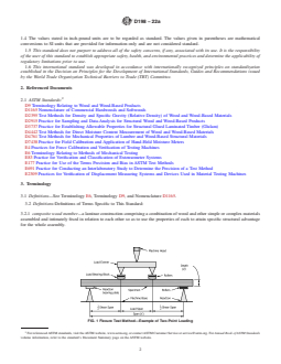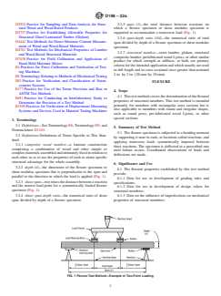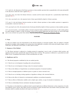 SIGNIFICANCE AND USE 6.1 The flexural properties established by this test method provide: 6.1.1 Data for use in development of grading rules and specifications; 6.1.2 Data for use in development of design values for structural members; 6.1.3 Data on the influence of imperfections on mechanical properties of structural members; 6.1.4 Data on strength properties of different species or grades in various structural sizes; 6.1.5 Data for use in checking existing equations or hypotheses relating to the structural behavior; 6.1.6 Data on the effects of chemical or environmental conditions on mechanical properties; 6.1.7 Data on effects of fabrication variables such as depth, taper, notches, or type of end joint in laminations; and 6.1.8 Data on relationships between mechanical and physical properties. 6.2 Procedures are described here in sufficient detail to permit duplication in different laboratories so that comparisons of results from different sources will be valid. Where special circumstances require deviation from some details of these procedures, these deviations shall be carefully described in the report (see Section 11). SCOPE 1.1 These test methods cover the evaluation of lumber and wood-based products in structural sizes by various testing procedures. 1.2 The test methods appear in the following order: Sections Flexure 4 – 11 Compression (Short Specimen) 13 – 20 Compression (Long Specimen) 21 – 28 Tension 29 – 36 Torsion 37 – 44 Shear Modulus 45 – 52 1.3 Notations and symbols relating to the various testing procedures are given in Appendix X1. 1.4 The values stated in inch-pound units are to be regarded as standard. The values given in parentheses are mathematical conversions to SI units that are provided for information only and are not considered standard. 1.5 This standard does not purport to address all of the safety concerns, if any, associated with its use. It is the responsibility of the user of this standard to establish appropriate safety, health, and environmental practices and determine the applicability of regulatory limitations prior to use. 1.6 This international standard was developed in accordance with internationally recognized principles on standardization established in the Decision on Principles for the Development of International Standards, Guides and Recommendations issued by the World Trade Organization Technical Barriers to Trade (TBT) Committee.