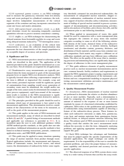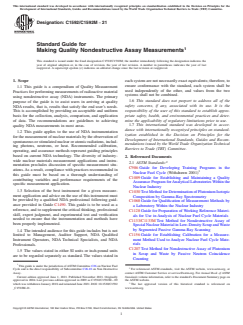 SIGNIFICANCE AND USE 4.1 NDA measurement practices aimed at achieving quality results are described in this guide. The application of the material provided in this guide should be determined on a case by case basis. Not all elements are required for all applications. 4.2 Nondestructive assay measurements are typically performed when the items measured or goals of the measurement program favor or require NDA over destructive analysis. NDA is typically favored when collecting a representative sample of the item is difficult or impractical (for example, scrap and waste items), personnel exposure would be significant, spread of contamination from sampling would occur, generation of secondary waste must be minimized, the weight and/or tare weight of the item cannot easily be determined (for example, in place process equipment), rapid turn-around of the measurement results is needed, or the NDA measurement is significantly less expensive than the equivalent destructive analysis. 4.3 The principles provided in this guide should be used to determine which type of measurement is best suited to the measurement application. This determination involves consideration of the characteristics of the items to be measured, as well as the goals of the measurement program. 4.4 This guide applies to the suite of NDA instruments and measurement methods, many of which are described in detail in Refs (1) and (2) .7 A partial listing of measurement methods and applicable use references is provided in 5.5.1. It is incumbent upon the user to seek additional guidance within ASTM method-specific standards, as this guide does not take precedence. Additional information on specific methods is best found in technical meeting transactions, journals, commercial application notes, and NRC/DOE publications. 4.5 This guide may be applied to many situations spanning the range of nuclear materials from product through waste. Typical applications include: the measurement and characterization of transuranic wastes,... SCOPE 1.1 This guide is a compendium of Quality Measurement Practices for performing measurements of radioactive material using nondestructive assay (NDA) instruments. The primary purpose of the guide is to assist users in arriving at quality NDA results, that is, results that satisfy the end user’s needs. This is accomplished by providing an acceptable and uniform basis for the collection, analysis, comparison, and application of data. The recommendations are guidelines to achieving quality NDA measurements in most areas. 1.2 This guide applies to the use of NDA instrumentation for the measurement of nuclear materials by the observation of spontaneous or stimulated nuclear or atomic radiations, including photons, neutrons, or heat. Recommended calibration, operating, and assurance methods represent guiding principles based on current NDA technology. The diversity of industry-wide nuclear materials measurement applications and instrumentation precludes discussion of specific measurement situations. As a result, compliance with practices recommended in this guide must be based on a thorough understanding of contributing variables and performance requirements of the specific measurement application. 1.3 Selection of the best instrument for a given measurement application and advice on the use of this instrument must be provided by a qualified NDA professional following guidance provided in Guide C1490. This guide is to be used as a reference, and to supplement the critical thinking, professional skill, expert judgment, and experimental test and verification needed to ensure that the instrumentation and methods have been properly implemented. 1.4 The intended audience for this guide includes but is not limited to Management, Auditor Support, NDA Qualified Instrument Operators, NDA Technical Specialists, and NDA Professionals. 1.5 The values stated in either SI units or inch-pound units are to be regarded separately as...