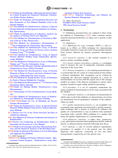 ASTM C1592/C1592M-21 is a guide published by ASTM International. Its full title is "Standard Guide for Making Quality Nondestructive Assay Measurements". This standard covers: SIGNIFICANCE AND USE 4.1 NDA measurement practices aimed at achieving quality results are described in this guide. The application of the material provided in this guide should be determined on a case by case basis. Not all elements are required for all applications. 4.2 Nondestructive assay measurements are typically performed when the items measured or goals of the measurement program favor or require NDA over destructive analysis. NDA is typically favored when collecting a representative sample of the item is difficult or impractical (for example, scrap and waste items), personnel exposure would be significant, spread of contamination from sampling would occur, generation of secondary waste must be minimized, the weight and/or tare weight of the item cannot easily be determined (for example, in place process equipment), rapid turn-around of the measurement results is needed, or the NDA measurement is significantly less expensive than the equivalent destructive analysis. 4.3 The principles provided in this guide should be used to determine which type of measurement is best suited to the measurement application. This determination involves consideration of the characteristics of the items to be measured, as well as the goals of the measurement program. 4.4 This guide applies to the suite of NDA instruments and measurement methods, many of which are described in detail in Refs (1) and (2) .7 A partial listing of measurement methods and applicable use references is provided in 5.5.1. It is incumbent upon the user to seek additional guidance within ASTM method-specific standards, as this guide does not take precedence. Additional information on specific methods is best found in technical meeting transactions, journals, commercial application notes, and NRC/DOE publications. 4.5 This guide may be applied to many situations spanning the range of nuclear materials from product through waste. Typical applications include: the measurement and characterization of transuranic wastes,... SCOPE 1.1 This guide is a compendium of Quality Measurement Practices for performing measurements of radioactive material using nondestructive assay (NDA) instruments. The primary purpose of the guide is to assist users in arriving at quality NDA results, that is, results that satisfy the end user’s needs. This is accomplished by providing an acceptable and uniform basis for the collection, analysis, comparison, and application of data. The recommendations are guidelines to achieving quality NDA measurements in most areas. 1.2 This guide applies to the use of NDA instrumentation for the measurement of nuclear materials by the observation of spontaneous or stimulated nuclear or atomic radiations, including photons, neutrons, or heat. Recommended calibration, operating, and assurance methods represent guiding principles based on current NDA technology. The diversity of industry-wide nuclear materials measurement applications and instrumentation precludes discussion of specific measurement situations. As a result, compliance with practices recommended in this guide must be based on a thorough understanding of contributing variables and performance requirements of the specific measurement application. 1.3 Selection of the best instrument for a given measurement application and advice on the use of this instrument must be provided by a qualified NDA professional following guidance provided in Guide C1490. This guide is to be used as a reference, and to supplement the critical thinking, professional skill, expert judgment, and experimental test and verification needed to ensure that the instrumentation and methods have been properly implemented. 1.4 The intended audience for this guide includes but is not limited to Management, Auditor Support, NDA Qualified Instrument Operators, NDA Technical Specialists, and NDA Professionals. 1.5 The values stated in either SI units or inch-pound units are to be regarded separately as...