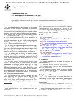 1.1 This standard guide provides a standard set of reference objects for use with automatic, automated, or autonomous unmanned ground vehicles (A-UGVs). The objects set includes typical objects found within industrial areas including, but not limited to: warehouses, hospitals, office spaces, and manufacturing facilities. Also, the objects set includes three test pieces from ANSI/ITSDF B56.5. The objects set is intended for use by A-UGV manufacturers and users to test the performance of A-UGVs when near the object(s). The objects set is minimized to include characteristics that have proven to cause interrupted A-UGV operation. Beyond this set of objects, Test Method F3418 is used to record most any object.