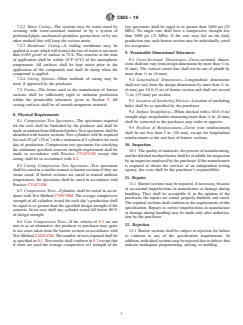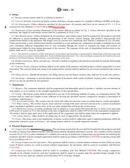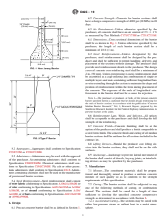 ABSTRACT This specification covers precast concrete barriers intended for use adjacent to a roadway or as a median to redirect vehicles unintentionally leaving the roadway. The acceptance criteria for these barriers shall be based on strength properties, dimensional properties, and end results. Conformance as to materials (cement, aggregates, admixtures, and steel reinforcements), design (concrete strength, air entrainment, dimensions, steel reinforcements, concrete finish, lifting devices, anchorage, and reinforcement laps, welds, and splicing), and manufacture (mixture, accelerated curing, water curing, membrane curing, and forms) should be observed precisely. Physical requirements shall be examined by compression, curing compression, and core compression tests. SCOPE 1.1 This specification covers precast concrete barriers, intended to be used adjacent to a roadway or as a median, to redirect vehicles unintentionally leaving the roadway. 1.2 The values stated in inch-pound units are to be regarded as standard. The values given in parentheses are mathematical conversions to SI units that are provided for information only and are not considered standard. 1.3 This international standard was developed in accordance with internationally recognized principles on standardization established in the Decision on Principles for the Development of International Standards, Guides and Recommendations issued by the World Trade Organization Technical Barriers to Trade (TBT) Committee.