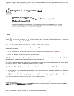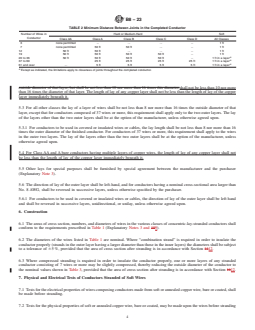 ABSTRACT This specification covers standard requirements for bare-concentric-lay stranded conductors made from round copper wires, either uncoated or coated with tin, lead, or lead alloy for general use for electrical purposes. These conductors shall be constructed with a central core surrounded by one or more layers of helically laid wires. The conductors shall be classified as follows: Class AA, Class A, Class B, Class C, and Class D. Sizes, number of wires, and diameter of wires in the various classes of concentric-lay-stranded conductors shall conform to the prescribed requirements. Welds and brazes may be made in rods or in wires prior to final drawing. The completed conductor of varying classes shall conform to the minimum distance required between the joints. Diameters, areas, and mass of concentric-lay-stranded copper conductors shall conform to the prescribed requirements. Physical and electrical tests of conductors stranded of hard-drawn or medium-hard-drawn wires shall be conducted before but not after stranding. The approximate mass and electrical resistance may be determined using the required increments. The material shall also conform to the temperature corrections factor for conductor resistance. SCOPE 1.1 This specification covers bare concentric-lay-stranded conductors made from round copper wires, either uncoated or coated with tin, lead, or lead alloy for general use for electrical purposes. These conductors shall be constructed with a central core surrounded by one or more layers of helically laid wires. Note 1: This specification also permits conductors for use as covered or insulated electrical conductors. Note 2: Sealed conductors, that are intended to prevent longitudinal water propagation and are further covered/insulated, are also permitted within the guidelines of this specification. 1.2 For the purposes of this specification, conductors are classified as follows (Explanatory Note 1 and Note 2): 1.2.1 Class AA—For bare conductors usually used in overhead lines. 1.2.2 Class A—For conductors to be covered with weather-resistant (weather-proof), slow-burning materials, and for bare conductors where greater flexibility than is afforded by Class AA is required. 1.2.3 Class B—For conductors to be insulated with various materials such as rubber, paper, varnished cloth, and so forth, and for the conductors indicated under Class A where greater flexibility is required. 1.2.4 Class C and Class D—For conductors where greater flexibility is required than is provided by Class B conductors. 1.3 The SI values for density are regarded as the standard. For all other properties, the inch-pound values are to be regarded as standard and the SI units may be approximate. 1.4 This international standard was developed in accordance with internationally recognized principles on standardization established in the Decision on Principles for the Development of International Standards, Guides and Recommendations issued by the World Trade Organization Technical Barriers to Trade (TBT) Committee.