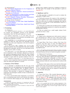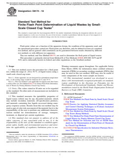 SIGNIFICANCE AND USE 5.1 This procedure is intended to be used to evaluate the ignitability of liquid wastes. 5.2 Flash point measures the response of the subsample to heat and an ignition source under controlled laboratory conditions. It is only one of a number of properties that shall be considered in assessing the overall flammability hazard of a liquid waste material. 5.3 Flash point can indicate the possible presence of highly volatile and flammable materials in a relatively nonvolatile or nonflammable material. 5.4 This test method uses a small sample volume (2 mL) and short test time (1 min). SCOPE 1.1 This test method covers the procedure for a flash point test, within the range of –20 to 70 °C, of liquid wastes using a small-scale closed cup tester. Note 1: Some apparatus are not designed for subambient temperature tests, so the testing range would be between 20 °C and 70 °C. Note 2: This test method is not applicable for liquid waste that forms a surface film (see Test Method D8175 for Finite Flash Point Determination of Wastes by Pensky-Martens Closed Cup Tester). 1.2 Units—The values stated in SI units are to be regarded as the standard. No other units of measurement are included in this standard. 1.3 This standard measures the ignitability properties of liquid wastes (which may be any discarded material), which may include secondary materials, off-specification products, and materials containing free liquids recovered during emergency response actions. Results from this test method may be used as part of a fire risk assessment of the material, but it is the responsibility of the user to perform any additional characterization needed for determination of storage, transport, treatment, or disposal per current regulations. 1.4 This standard does not purport to address all of the safety concerns, if any, associated with its use. It is the responsibility of the user of this standard to establish appropriate safety, health, and environmental practices and determine the applicability of regulatory limitations prior to use. Warning statements appear throughout. See applicable Safety Data Sheets (SDS) for information about certified reference materials (CRMs) or secondary working standards (SWSs) that may be used in this test method. SDS may also be useful if some components of the waste sample are known. 1.5 This international standard was developed in accordance with internationally recognized principles on standardization established in the Decision on Principles for the Development of International Standards, Guides and Recommendations issued by the World Trade Organization Technical Barriers to Trade (TBT) Committee.