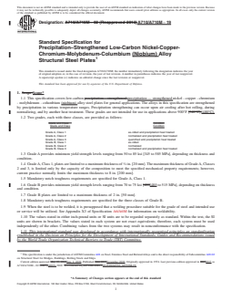 ABSTRACT This specification covers precipitation-strengthened low carbon nickel copper-chromium-molybdenum-columbium alloy structural steel plates. Precipitation strengthening and precipitation heat treatment shall be performed on the material to enhance and alter the required structural and mechanical properties. Heat analysis shall be used to determine the required chemical composition for carbon, manganese, phosphorus, sulfur, nickel, chromium, molybdenum, copper, columbium, and titanium. Yield strength, tensile strength, and elongation shall be evaluated using tension test and the required toughness shall be evaluated using notch toughness test. SCOPE 1.1 This specification covers low-carbon precipitation — strengthened nickel - copper - chromium - molybdenum - columbium (niobium) alloy steel plates for general applications. The alloys in this specification are strengthened by precipitation in various temperature ranges. Precipitation strengthening can occur upon air cooling after hot rolling, during normalizing, and by another heat treatment. These grades are not intended for use in applications above 900°F [480°C]. 1.2 Two grades, each with three classes, are provided as follows: Grade and Class Condition Grade A, Class 1 as-rolled and precipitation heat treated Grade A, Class 2 normalized and precipitation heat treated Grade A, Class 3 quenched and precipitation heat treated Grade B, Class 1 as-rolled Grade B, Class 2 normalized Grade B, Class 3 normalized and precipitation heat treated 1.3 Grade A provides minimum yield strength levels ranging from 50 to 85 ksi [345 to 585 MPa], depending on thickness and condition. 1.4 Grade A, Class 1, plates are limited to a maximum thickness of 3/4 in. [20 mm]. The maximum thickness of Grade A, Classes 2 and 3, is limited only by the capacity of the composition to meet the specified mechanical property requirements; however, current practice normally limits the maximum thickness to 8 in. [200 mm]. 1.5 Mandatory notch toughness requirements are specified for Grade A, Class 1. 1.6 Grade B provides minimum yield strength levels ranging from 70 to 75 ksi [485 to 515 MPa], depending on thickness and condition. 1.7 Grade B plates are limited to a maximum thickness of 2 in. [50 mm]. 1.8 Mandatory notch toughness requirements are specified for the three classes of Grade B. 1.9 When the steel is to be welded, it is presupposed that a welding procedure suitable for the grade of steel and intended use or service will be utilized. See Appendix X3 of Specification A6/A6M for information on weldability. 1.10 The values stated in either inch-pound units or SI units are to be regarded separately as standard. Within the text, the SI units are shown in brackets. The values stated in each system are not exact equivalents; therefore, each system must be used independently of the other. Combining values from the two systems may result in nonconformance with the specification. 1.11 This international standard was developed in accordance with internationally recognized principles on standardization established in the Decision on Principles for the Development of International Standards, Guides and Recommendations issued by the World Trade Organization Technical Barriers to Trade (TBT) Committee.