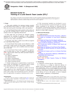 ASTM F2685-14(2022) - Standard Guide for Training of a Land Search Team Leader (STL) defines the minimum knowledge, skills, and abilities required for individuals to serve effectively as Land Search Team Leaders. Developed by ASTM International, this guide ensures team leaders are equipped to coordinate search operations conducted on land, including urban, wilderness, disaster, and mountainous environments. It is an essential resource for organizations, agencies, and individuals developing or evaluating training programs for search and rescue (SAR) operations on land.