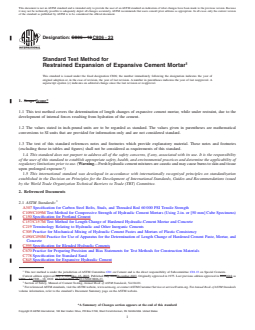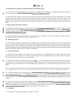 ABSTRACT This test method covers the standard procedure for determination of length changes of expansive cement mortar, while under restraint, due to the development of internal forces resulting from hydration of the cement. The test apparatus is comprised of the following: molds for casting test specimens; restraining cage which consists of a threaded steel rod with steel end plates held in place by cap nuts for corrosion prevention; length comparator; tamper which shall be made of nonabsorptive, nonabrasive material such as medium-hard rubber or seasoned oak wood; device for demolding specimens; weights and weighing devices; glass graduates to measure the mixing water in a single operation; an electrically driven mechanical mixer equipped with paddle and mixing bowl; and trowel which shall have a steel blade with straight edges. The sand to be used shall comply with the graded sand requirement and shall be handled in such a manner as to prevent segregation. Details on preparation and assembly of specimen molds and restraining cage, proportioning and mixing of mortars, molding, and curing of specimens are discussed. The expansion and shrinkage of the test specimens at any age shall be calculated and the length-change data, expressed as linear expansion or contraction based on the length of the specimen at any time of molding, shall be reported. Bias and precision in the batch, single, and multi-laboratory operation shall also be identified. SCOPE 1.1 This test method covers the determination of length changes of expansive cement mortar, while under restraint, due to the development of internal forces resulting from hydration of the cement. 1.2 The values stated in inch-pound units are to be regarded as standard. The values given in parentheses are mathematical conversions to SI units that are provided for information only and are not considered standard. 1.3 The text of this standard references notes and footnotes which provide explanatory material. These notes and footnotes (excluding those in tables and figures) shall not be considered as requirements of this standard. 1.4 This standard does not purport to address all of the safety concerns, if any, associated with its use. It is the responsibility of the user of this standard to establish appropriate safety, health, and environmental practices and determine the applicability of regulatory limitations prior to use. (Warning—Fresh hydraulic cement mixtures are caustic and may cause burns to skin and tissue upon prolonged exposure.2) 1.5 This international standard was developed in accordance with internationally recognized principles on standardization established in the Decision on Principles for the Development of International Standards, Guides and Recommendations issued by the World Trade Organization Technical Barriers to Trade (TBT) Committee.