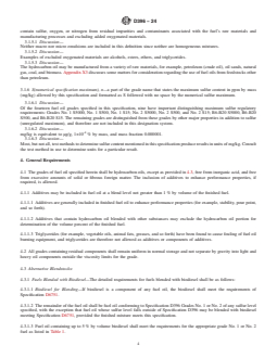 ABSTRACT This specification covers grades of fuel oil intended for use in various types of fuel-oil-burning equipment under various climatic and operating conditions. These grades include the following: Grades No. 1 S5000, No. 1 S500, No. 2 S5000, and No. 2 S500 for use in domestic and small industrial burners; Grades No. 1 S5000 and No. 1 S500 adapted to vaporizing type burners or where storage conditions require low pour point fuel; Grades No. 4 (Light) and No. 4 (Heavy) for use in commercial/industrial burners; and Grades No. 5 (Light), No. 5 (Heavy), and No. 6 for use in industrial burners. Preheating is usually required for handling and proper atomization. The grades of fuel oil shall be homogeneous hydrocarbon oils, free from inorganic acid, and free from excessive amounts of solid or fibrous foreign matter. Grades containing residual components shall remain uniform in normal storage and not separate by gravity into light and heavy oil components outside the viscosity limits for the grade. The grades of fuel oil shall conform to the limiting requirements prescribed for: (1) flash point, (2) water and sediment, (3) physical distillation or simulated distillation, (4) kinematic viscosity, (5) Ramsbottom carbon residue, (6) ash, (7) sulfur, (8) copper strip corrosion, (9) density, and (10) pour point. The test methods for determining conformance to the specified properties are given. SCOPE 1.1 This specification (see Note 1) covers grades of fuel oil intended for use in various types of fuel-oil-burning equipment under various climatic and operating conditions. These grades are described as follows: 1.1.1 Grades No. 1 S5000, No. 1 S500, No. 1 S15, No. 2 S5000, No. 2 S500, and No. 2 S15 are middle distillate fuels for use in domestic and small industrial burners. Grades No. 1 S5000, No. 1 S500, and No. 1 S15 are particularly adapted to vaporizing type burners or where storage conditions require low pour point fuel. 1.1.2 Grades B6–B20 S5000, B6–B20 S500, and B6–B20 S15 are middle distillate fuel/biodiesel blends for use in domestic and small industrial burners. 1.1.3 Grades No. 4 (Light) and No. 4 are heavy distillate fuels or middle distillate/residual fuel blends used in commercial/industrial burners equipped for this viscosity range. 1.1.4 Grades No. 5 (Light), No. 5 (Heavy), and No. 6 are residual fuels of increasing viscosity and boiling range, used in industrial burners. Preheating is usually required for handling and proper atomization. Note 1: For information on the significance of the terminology and test methods used in this specification, see Appendix X1. Note 2: A more detailed description of the grades of fuel oils is given in X1.3. 1.2 This specification is for the use of purchasing agencies in formulating specifications to be included in contracts for purchases of fuel oils and for the guidance of consumers of fuel oils in the selection of the grades most suitable for their needs. 1.3 Nothing in this specification shall preclude observance of federal, state, or local regulations which can be more restrictive. 1.4 The values stated in SI units are to be regarded as standard. 1.4.1 Non-SI units are provided in Table 1 and Table 2 and in 7.1.2.1/7.1.2.2 because these are common units used in the industry. Note 3: The generation and dissipation of static electricity can create problems in the handling of distillate burner fuel oils. For more information on the subject, see Guide D4865. 1.5 This international standard was developed in accordance with internationally recognized principles on standardization established in the Decision on Principles for the Development of International Standards, Guides and Recommendations issued by the World Trade Organization Technical Barriers to Trade (TBT) Committee.