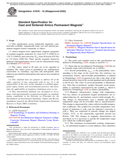 ABSTRACT This specification covers technically important, commercially available, magnetically hard, cast and sintered permanent magnets known commonly as Alnico. Alnico magnets have approximate magnetic properties of residual magnetic induction from 0.52 T (5200 G) to 1.35 T (13500 G) and coercivity from 38 kA/m (475 Oe) to 175 kA/m (2200 Oe). Their specific magnetic hysteresis behavior (demagnetization curves) can be characterized using Test Method A977/A977M. SCOPE 1.1 This specification covers technically important, commercially available, magnetically hard, cast and sintered permanent magnets known commonly as Alnico. 1.2 Alnico magnets have approximate magnetic properties of residual magnetic induction, Br, from 0.52 T (5200 G) to 1.35 T (13500 G) and coercivity, HcB, from 38 kA/m (475 Oe) to 175 kA/m (2200 Oe). Their specific magnetic hysteresis behavior (demagnetization curves) can be characterized using Test Method A977/A977M. 1.3 The values stated in SI units are to be regarded as standard. The values given in parentheses are mathematical conversions to customary (cgs-emu and inch-pound) units which are provided for information only and are not considered standard. 1.4 This standard does not purport to address all of the safety concerns, if any, associated with its use. It is the responsibility of the user of this standard to establish appropriate safety, health, and environmental practices and determine the applicability of regulatory limitations prior to use. 1.5 This international standard was developed in accordance with internationally recognized principles on standardization established in the Decision on Principles for the Development of International Standards, Guides and Recommendations issued by the World Trade Organization Technical Barriers to Trade (TBT) Committee.