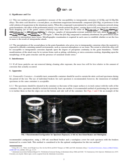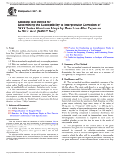 SIGNIFICANCE AND USE 4.1 This test method provides a quantitative measure of the susceptibility to intergranular corrosion of Al-Mg and Al-Mg-Mn alloys. The nitric acid dissolves a second phase, an aluminum-magnesium intermetallic compound (βAl-Mg), in preference to the solid solution of magnesium in the aluminum matrix. When this compound is precipitated in a relatively continuous network along grain boundaries, the effect of the preferential attack is to corrode around the grains, causing them to fall away from the specimens. Such dropping out of the grains causes relatively large mass losses of the order of 25 mg/cm2 to 75 mg/cm2 (160 mg/in.2 to 480 mg/in.2), whereas, samples of intergranular-resistant materials lose only about 1 mg/cm2 to 15 mg/cm2 (10 mg/in.2 to 100 mg/in.2). When the βAl-Mg compound is randomly distributed, the preferential attack can result in intermediate mass losses. Metallographic examination is required in such cases to establish whether or not the loss in mass is the result of intergranular attack. 4.2 The precipitation of the second phase in the grain boundaries also gives rise to intergranular corrosion when the material is exposed to chloride-containing natural environments, such as seacoast atmospheres or sea water. The extent to which the alloy will be susceptible to intergranular corrosion depends upon the degree of precipitate continuity in the grain boundaries. Visible manifestations of the attack may be in various forms such as pitting, exfoliation, or stress-corrosion cracking, depending upon the morphology of the grain structure and the presence of sustained tensile stress.3 SCOPE 1.1 This test method, also known as the Nitric Acid Mass Loss Test (NAMLT), covers a procedure for constant immersion intergranular corrosion testing of 5XXX series aluminum alloys. 1.2 This test method is applicable only to wrought products. 1.3 This test method covers type of specimen, specimen preparation, test environment, and method of exposure. 1.4 The values stated in SI units are to be regarded as the standard. The values given in parentheses are for information only. 1.5 This standard does not purport to address all of the safety concerns, if any, associated with its use. It is the responsibility of the user of this standard to establish appropriate safety, health, and environmental practices and determine the applicability of regulatory limitations prior to use. 1.6 This international standard was developed in accordance with internationally recognized principles on standardization established in the Decision on Principles for the Development of International Standards, Guides and Recommendations issued by the World Trade Organization Technical Barriers to Trade (TBT) Committee.