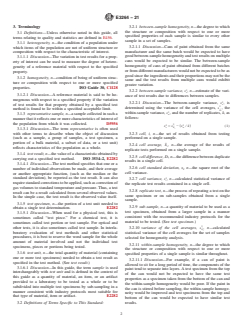 SIGNIFICANCE AND USE 5.1 This guide presents techniques and guidance for evaluating and assuring homogeneity of individual samples or bulk materials and can be used for either interlaboratory or intra-laboratory studies. The types of studies include, but are not limited to, studies to determine precision estimates for test methods, proficiency testing programs, and studies related to quality control of testing within a single laboratory. 5.2 Because the test results of any laboratory study are affected by the quality of the samples tested, producing homogeneous samples and determining the degree of homogeneity is important for interpreting the results of the study. 5.3 Five techniques are presented in this guide to evaluate sample homogeneity for a range of circumstances and degrees of rigor. The circumstances under which the studies are conducted and the degree of rigor required may differ. The user should consider the circumstances listed in each technique to determine which is appropriate for the study at hand. 5.4 Each of the Techniques 1, 2, and 3 provides a procedure for testing and evaluating sample homogeneity when replicate testing of the samples is possible. Technique 4 provides a plan to evaluate sample homogeneity when replicate testing is not possible. Technique 5 recommends practices for producing homogeneous samples for circumstances when homogeneity testing is not possible. 5.5 When the conditions of adequate within-sample homogeneity and between-sample homogeneity are satisfied, any differences in test results on multiple samples can reasonably be attributed to testing variation and not due to sample variation. 5.6 When differences within or between samples are discovered and the samples are deemed insufficiently homogeneous, the sample preparation process can be improved or corrected and a new set of samples can be prepared. Or, in cases where the sample homogeneity cannot be improved or for other reasons when the samples must be used, the method of eval... SCOPE 1.1 This guide presents techniques and guidance for evaluating and assuring homogeneity of individual samples and bulk materials used for interlaboratory and intra-laboratory studies. 1.2 This guide is applicable to samples and reference materials used for proficiency testing programs and for interlaboratory studies to determine precision estimates for test methods. It may also be useful for activities related to quality control of testing within a single laboratory. 1.3 Five techniques are presented for assessing sample homogeneity. The five techniques are not an exhaustive list of available techniques for assessing homogeneity of samples, but the techniques were chosen to cover a range of circumstances (and various degrees of rigor required) for laboratory studies of various types and purposes. 1.4 Each of the first four techniques provides a scheme for testing for homogeneity and a statistical procedure for evaluating the results of the homogeneity testing. The circumstances are described for which each of the techniques is suited. 1.5 For circumstances when homogeneity testing is not possible, the fifth technique provides guidance for producing homogeneous samples. 1.6 The appendixes of this guide provide example spreadsheets for Techniques 1, 2, 3, and 4. 1.7 This guide is not intended for evaluation of certified reference materials (CRMs) or materials used for calibration. 1.8 Units—The system of units for this standard is not specified. Dimensional quantities in the standard are presented only as illustrations of calculation methods. The examples are not binding on products or test methods treated. 1.9 This standard does not purport to address all of the safety concerns, if any, associated with its use. It is the responsibility of the user of this standard to establish appropriate safety, health, and environmental practices and determine the applicability of regulatory limitations prior to ...