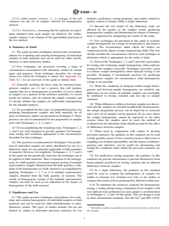 1.3 Five techniques are presented for assessing sample homogeneity. The five techniques are not an exhaustive list of available techniques for assessing homogeneity of samples, but the techniques were chosen to cover a range of circumstances (and various degrees of rigor required) for laboratory studies of various types and purposes.