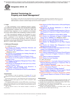 ASTM E2135-22 is a standard published by ASTM International. Its full title is "Standard Terminology for Property and Asset Management". This standard covers: SCOPE 1.1 This terminology covers traditional property management definitions and some of the terms introduced in additional asset management standards that are used most often and considered most important. As new standards are developed, new terms will be added to this terminology in future revisions. 1.2 This international standard was developed in accordance with internationally recognized principles on standardization established in the Decision on Principles for the Development of International Standards, Guides and Recommendations issued by the World Trade Organization Technical Barriers to Trade (TBT) Committee.
