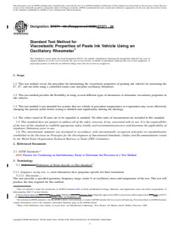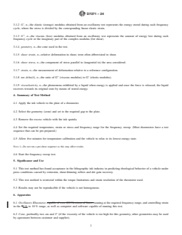 SIGNIFICANCE AND USE 5.1 This test method has found acceptance in the lithographic ink industry in predicting rheological behavior of a vehicle under press conditions caused by extrusion, shear-thinning rollers and dot gain recovery. 5.2 This test method is restricted within the torque limitations and strain resolution of the rheometer used. 5.3 Results may not be reproducible if the vehicle is not homogenous. SCOPE 1.1 This test method covers the procedure for determining the viscoelastic properties of printing ink vehicles by measuring the G', G”, and tan delta using a controlled strain cone and plate oscillatory rheometer. 1.2 This test method provides the flexibility of using several different types of rheometers to determine viscoelastic properties in ink vehicles. 1.3 This test method is not intended for systems that are volatile at procedure temperatures as evaporation may occur effectively changing the percent solids before testing is finished and significantly altering the rheology. 1.4 The values stated in SI units are to be regarded as standard. No other units of measurement are included in this standard. 1.5 This standard does not purport to address all of the safety concerns, if any, associated with its use. It is the responsibility of the user of this standard to establish appropriate safety, health, and environmental practices and determine the applicability of regulatory limitations prior to use. 1.6 This international standard was developed in accordance with internationally recognized principles on standardization established in the Decision on Principles for the Development of International Standards, Guides and Recommendations issued by the World Trade Organization Technical Barriers to Trade (TBT) Committee.