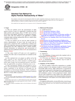 ASTM D1943-20 is a standard published by ASTM International. Its full title is "Standard Test Method for Alpha Particle Radioactivity of Water ". This standard covers: SIGNIFICANCE AND USE 5.1 This test method was developed for the purpose of measuring gross alpha radioactivity in water. It is used for the analysis of both process and environmental water to determine gross alpha activity which is often a result of natural radioactivity present in minerals. SCOPE 1.1 This test method covers the measurement of alpha particle activity of water. It is applicable to nuclides that emit alpha particles with energies above 3.9 MeV and at activity levels above 0.02 Bq/mL (540 pCi/L) of radioactive homogeneous water. This test method is not applicable to samples containing alpha-emitting radionuclides that are volatile under conditions of the analysis. 1.2 This test method can be used for either absolute or relative determinations. In tracer work, the results may be expressed by comparison with a standard that is defined to be 100 %. For radioassay, data may be expressed in terms of alpha disintegration rates after calibration with a suitable standard. General information on radioactivity and measurement of radiation has been published in Refs (1-3)2 and summarized in Practices D3648. 1.3 The values stated in SI units are to be regarded as standard. No other units of measurement are included in this standard. 1.4 This standard does not purport to address all of the safety concerns, if any, associated with its use. It is the responsibility of the user of this standard to establish appropriate safety, health, and environmental practices and determine the applicability of regulatory limitations prior to use. 1.5 This international standard was developed in accordance with internationally recognized principles on standardization established in the Decision on Principles for the Development of International Standards, Guides and Recommendations issued by the World Trade Organization Technical Barriers to Trade (TBT) Committee.