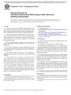 ASTM D5741-96(2023), Standard Practice for Characterizing Surface Wind Using a Wind Vane and Rotating Anemometer, provides a systematic approach for the measurement and characterization of surface wind. This international standard applies to the use of wind vanes and rotating anemometers to collect key wind data, such as wind speed, wind direction, gust speeds, and standard deviations. Developed by ASTM International, this practice is tailored for efficient data collection, ensuring both high utility and minimal data storage requirements.