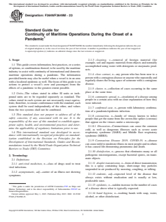 SIGNIFICANCE AND USE 5.1 This guide is designed to be used both onboard a vessel and by the operating entity ashore. It should be recognized that this guide provides general information applicable across all sectors of the maritime industry. Because of the nature of pandemics, it cannot provide detailed information concerning a specific type of pandemic, nor can it provide specific recommendations applicable to all sectors of the maritime industry. It should be used to provide a starting point and reference as to the best practices and actions that should be taken to protect the vessel and its crew and passengers. SCOPE 1.1 This guide covers information, best practices, or a series of options, or combinations thereof, to be used by the maritime industry to assist with continuity of international and domestic maritime operations during a pandemic. The information provided herein may also be useful when a vessel is in an area with a localized epidemic as well. The focus of this guide is on actions to protect a vessel’s crew and passengers from the effects of a pandemic to the greatest extent possible. 1.2 Units—The values stated in either SI units or inch-pound units are to be regarded separately as standard. The values stated in each system are not necessarily exact equivalents; therefore, to ensure conformance with the standard, each system shall be used independently of the other, and values from the two systems shall not be combined. 1.3 This standard does not purport to address all of the safety concerns, if any, associated with its use. It is the responsibility of the user of this standard to establish appropriate safety, health, and environmental practices and determine the applicability of regulatory limitations prior to use. 1.4 This international standard was developed in accordance with internationally recognized principles on standardization established in the Decision on Principles for the Development of International Standards, Guides and Recommendations issued by the World Trade Organization Technical Barriers to Trade (TBT) Committee.