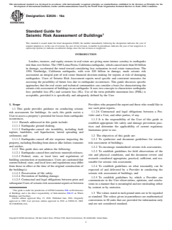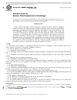 This guide provides guidance on conducting seismic risk assessments for buildings. As such, this guide assists a User to assess a property’s potential for losses from earthquake occurrences. Hazards addressed in this guide include earthquake ground shaking, earthquake-caused site instability, including fault rupture, landslides and soil liquefaction, lateral spreading and settlement, and earthquake-caused off-site response impacting the property, including flooding from dam or dike failure, tsunamis and seiches. This guide is intended to reflect a commercially prudent and reasonable investigation for performance of seismic risk assessments. Seismic risk assessments may be performed for an individual building or a group of buildings. This guide provides suggested approaches for the performance of five different types of seismic risk assessments. Building stability, site stability, building damageability, contents damageability, business interruption, and application and temporal relevance of report. Each is intended to serve different financial and management needs of the User. An earthquake ground motion assessment should be conducted in conjuction with probable loss evaluations for building damageability and may have applications in some scenario loss studies, as well as building stability or site stability assessments. Seismic risk assessments may consider varying degrees of assessment of a building or buildings from Level 0 to Level 3.