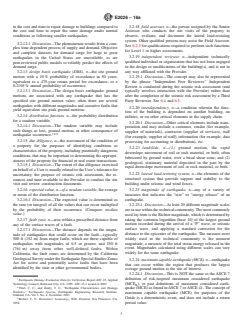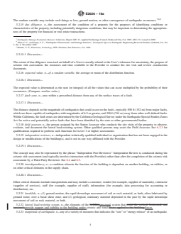 ABSTRACT This guide provides guidance on conducting seismic risk assessments for buildings. As such, this guide assists a User to assess a property’s potential for losses from earthquake occurrences. Hazards addressed in this guide include earthquake ground shaking, earthquake-caused site instability, including fault rupture, landslides and soil liquefaction, lateral spreading and settlement, and earthquake-caused off-site response impacting the property, including flooding from dam or dike failure, tsunamis and seiches. This guide is intended to reflect a commercially prudent and reasonable investigation for performance of seismic risk assessments. Seismic risk assessments may be performed for an individual building or a group of buildings. This guide provides suggested approaches for the performance of five different types of seismic risk assessments. Building stability, site stability, building damageability, contents damageability, business interruption, and application and temporal relevance of report. Each is intended to serve different financial and management needs of the User. An earthquake ground motion assessment should be conducted in conjuction with probable loss evaluations for building damageability and may have applications in some scenario loss studies, as well as building stability or site stability assessments. Seismic risk assessments may consider varying degrees of assessment of a building or buildings from Level 0 to Level 3. SIGNIFICANCE AND USE 4.1 Uses—This Guide is intended for use on a voluntary basis by parties such as lenders, loan servicers, insurers and equity investors in real estate (Users) who wish to estimate possible earthquake losses to buildings. This guide outlines procedures for conducting a seismic risk assessment for a specific User considering the User's requirements for due diligence. The specific purpose of this guide is to provide Users with seismic risk assessment during the anticipated term for holding either the mortgage or the deed. A seismic risk assessment prepared in accordance with this guide should reference or state that the guidance in this document was used as a basis for the report and should also identify any deviations from the guidelines. This guide is intended to reflect a commercially prudent and reasonable investigation for performance of seismic risk assessments. 4.1.1 Users—This Guide is designed to assist the User in developing information about the earthquake-related damage potential of a building, or groups of buildings. 4.1.1.1 Use of this guide may permit a User to satisfy, in part, their requirements for due diligence in assessing a building’s potential for losses associated with earthquakes for real estate transactions. 4.1.2 Types of Investigations—This guide provides suggested approaches for the performance of five different types of assessments. Each is intended to serve different financial and management needs of the User. Several of these types of assessment specifically depend on characterization of the earthquake ground motion as given in Section 7. 4.1.2.1 Building Stability (BS)—Assessment of whether the building will maintain vertical load-carrying capacity in whole or in part during considered earthquake ground motions (see Section 8). 4.1.2.2 Site Stability (SS)—Assessment of the likelihood that the site will remain stable in earthquakes and is not subject to failure through faulting, soil liquefaction, landslide, or other site respo... SCOPE 1.1 This guide provides guidance on conducting seismic risk assessments for buildings. As such, this guide assists a User to assess a property's potential for losses from earthquake occurrences. 1.1.1 Hazards addressed in this guide include: 1.1.1.1 Earthquake ground shaking, 1.1.1.2 Earthquake-caused site instability, including fault rupture, landslides, soil liquefaction, lateral spreading and settlement, and 1.1.1.3 Earthquake-caused off-site response impacting ...