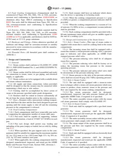 ABSTRACT This specification covers food cookers and food reheaters which use steam as the heat source. These units are also known as steamers, steam ovens, and steam cookers which utilize steam generated by gas, electric heat, or steam coil sources, or a combination thereof, in commercial and institutional food service establishments. This specification can be used for zero- pressure steam cookers, pressure steamers, and combination pressure/pressureless steamers and does not cover steam cooking equipment used by food processors who normally package the food that they cook. Steam cookers covered by this specification are classified by type, grade, class, size, style: Types IA, IB, II, and III; Grades A, B, and C; Classes 1, 2, 3, 4, 5, 6, 7, 8, 9, 10, and 11; and Sizes a, b, and c. Materials used shall be free from defects, which would affect the performance or maintainability of individual components, or of the overall assembly. Steam cooker shall be delivered assembled and ready for connection to steam, water, or gas piping, and electrical supply, as applicable. SCOPE 1.1 This specification covers food cookers and food reheaters which use steam as the heat source. These units are also known as steamers, steam ovens, and steam cookers which utilize steam generated by gas, electric heat, or steam coil sources, or a combination thereof, in commercial and institutional food service establishments. This specification can be used for sub-zero-pressure steamers, pressure steamers, combination pressure/pressureless steamers, boilerless steamers, and connectionless steamers, and does not cover steam cooking equipment used by food processors who normally package the food that they cook. 1.2 The values stated in inch-pound units are to be regarded as the standard. The SI values given in parentheses are provided for information only. 1.3 This standard may involve hazardous materials, operations, and equipment. This standard does not purport to address all of the safety concerns, if any, associated with its use. It is the responsibility of the user of this standard to establish appropriate safety, health, and environmental practices and determine the applicability of regulatory limitations prior to use. 1.4 This international standard was developed in accordance with internationally recognized principles on standardization established in the Decision on Principles for the Development of International Standards, Guides and Recommendations issued by the World Trade Organization Technical Barriers to Trade (TBT) Committee.