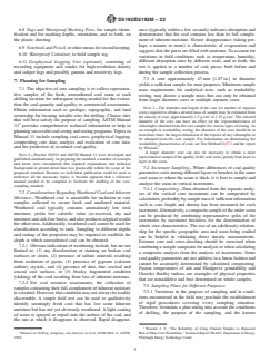 SIGNIFICANCE AND USE 5.1 A properly collected sample that includes the total coal bed interval provides a sample that is a representative cross section of the coal bed at the point of sampling. Core samples are taken for subsequent testing needed for evaluation of coal quality and characterization for commercial evaluations, for planning of mining operations to maintain coal quality, for the determination of coal rank in accordance with Classification D388, and for geologic coal resource studies. Note 1: Because of the potential for lateral variability, a sample may not represent the quality of the coal bed at another sample point. The reliability of the data generated from core samples is dependent on the number and spacing of the sample points and the variability of the coal characteristics in a given area. 5.2 Moisture determined directly from a core sample shall be considered questionable in any core sample because of possible contamination from drilling fluids and groundwater. If a more representative estimate of the inherent moisture content of the core sample (with the exception of certain low-rank coals) is desired, the sample should be analyzed according to Test Method D1412. SCOPE 1.1 This practice describes procedures for collecting and handling a coal sample from a core recovered from a borehole. 1.2 Units—The values stated in either SI units or inch-pound units are to be regarded separately as standard. The values stated in each system are not necessarily exact equivalents; therefore, to ensure conformance with the standard, each system shall be used independently of the other, and values from the two systems shall not be combined. 1.3 This standard does not purport to address all of the safety concerns, if any, associated with its use. It is the responsibility of the user of this standard to establish appropriate safety, health, and environmental practices and determine the applicability of regulatory limitations prior to use. 1.4 This international standard was developed in accordance with internationally recognized principles on standardization established in the Decision on Principles for the Development of International Standards, Guides and Recommendations issued by the World Trade Organization Technical Barriers to Trade (TBT) Committee.