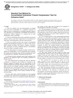1.1 This test method covers the determination of strength and stress-strain relationships of a cylindrical specimen of either an intact, reconstituted, or remolded saturated cohesive soil. Specimens are isotropically consolidated and sheared in compression without drainage at a constant rate of axial deformation (strain controlled).