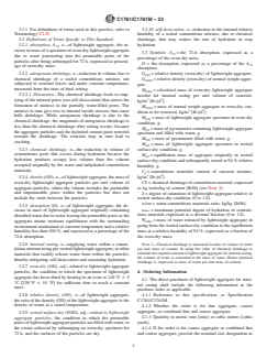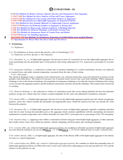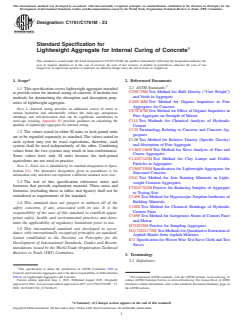 ASTM C1761/C1761M-23 is a technical specification published by ASTM International. Its full title is "Standard Specification for Lightweight Aggregate for Internal Curing of Concrete". This standard covers: SCOPE 1.1 This specification covers lightweight aggregate intended to provide water for internal curing of concrete. It includes test methods for determining the absorption and desorption properties of lightweight aggregate. Note 1: Internal curing provides an additional source of water to sustain hydration and substantially reduce the early-age autogenous shrinkage and self-desiccation that can be significant contributors to early-age cracking. Appendix X1 provides guidance on calculating the quantity of lightweight aggregate for internal curing. 1.2 The values stated in either SI units or inch-pound units are to be regarded separately as standard. The values stated in each system may not be exact equivalents; therefore, each system shall be used independently of the other. Combining values from the two systems may result in non-conformance. Some values have only SI units because the inch-pound equivalents are not used in practice. Note 2: Sieve size is identified by its standard designation in Specification E11. The alternative designation given in parentheses is for information only and does not represent a different standard sieve size. 1.3 The text of this specification references notes and footnotes that provide explanatory material. These notes and footnotes (excluding those in tables and figures) shall not be considered as requirements of the standard. 1.4 This standard does not purport to address all of the safety concerns, if any, associated with its use. It is the responsibility of the user of this standard to establish appropriate safety, health, and environmental practices and determine the applicability of regulatory limitations prior to use. 1.5 This international standard was developed in accordance with internationally recognized principles on standardization established in the Decision on Principles for the Development of International Standards, Guides and Recommendations issued by the World Trade Organization Technical Barriers to Trade (TBT) Committee.