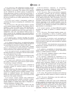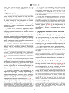 SIGNIFICANCE AND USE 4.1 Use as an Analytical Tool—Mathematical methods provide an analytical tool to be employed for many applications related to absorbed dose determinations in radiation processing. Mathematical calculations may not be used as a substitute for routine dosimetry in some applications (for example, medical device sterilization, food irradiation). 4.2 Dose Calculation—Absorbed-dose calculations may be performed for a variety of photon/electron environments and irradiator geometries. 4.3 Evaluate Process Effectiveness—Mathematical models may be used to evaluate the impact of changes in product composition, loading configuration, and irradiator design on dose distribution. 4.4 Complement or Supplement to Dosimetry—Dose calculations may be used to establish a detailed understanding of dose distribution, providing a spatial resolution not obtainable through measurement. Calculations may be used to reduce the number of dosimeters required to characterize a procedure or process (for example, dose mapping). 4.5 Alternative to Dosimetry—Dose calculations may be used when dosimetry is impractical (for example, granular materials, materials with complex geometries, material contained in a package where dosimetry is not practical or possible). 4.6 Facility Design—Dose calculations are often used in the design of a new irradiator and can be used to help optimize dose distribution in an existing facility or radiation process. The use of modeling in irradiator design can be found in Refs (2-7). 4.7 Validation—The validation of the model should be done through comparison with reliable and traceable dosimetric measurements. The purpose of validation is to demonstrate that the mathematical method makes reliable predictions of dose and other transport quantities. Validation compares predictions or theory to the results of an appropriate experiment. The degree of validation is commensurate with the application. Guidance is given in the documents referenced in Annex A2. ... SCOPE 1.1 This guide describes different mathematical methods that may be used to calculate absorbed dose and criteria for their selection. Absorbed-dose calculations can determine the effectiveness of the radiation process, estimate the absorbed-dose distribution in product, or supplement or complement, or both, the measurement of absorbed dose. 1.2 Radiation processing is an evolving field and annotated examples are provided in Annex A6 to illustrate the applications where mathematical methods have been successfully applied. While not limited by the applications cited in these examples, applications specific to neutron transport, radiation therapy and shielding design are not addressed in this document. 1.3 This guide covers the calculation of radiation transport of electrons and photons with energies up to 25 MeV. 1.4 The mathematical methods described include Monte Carlo, point kernel, discrete ordinate, semi-empirical and empirical methods. 1.5 This guide is limited to the use of general purpose software packages for the calculation of the transport of charged or uncharged particles and photons, or both, from various types of sources of ionizing radiation. This standard is limited to the use of these software packages or other mathematical methods for the determination of spatial dose distributions for photons emitted following the decay of 137Cs or 60Co, for energetic electrons from particle accelerators, or for X-rays generated by electron accelerators. 1.6 This guide assists the user in determining if mathematical methods are a useful tool. This guide may assist the user in selecting an appropriate method for calculating absorbed dose. The user must determine whether any of these mathematical methods are appropriate for the solution to their specific application and what, if any, software to apply. Note 1: The user is urged to apply these predictive techniques while being aware of the need for experien...