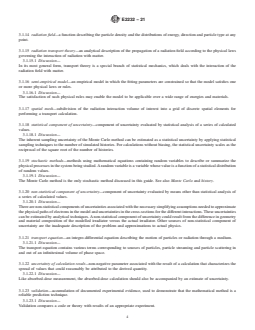 ASTM E2232-21 is a guide published by ASTM International. Its full title is "Standard Guide for Selection and Use of Mathematical Methods for Calculating Absorbed Dose in Radiation Processing Applications". This standard covers: SIGNIFICANCE AND USE 4.1 Use as an Analytical Tool—Mathematical methods provide an analytical tool to be employed for many applications related to absorbed dose determinations in radiation processing. Mathematical calculations may not be used as a substitute for routine dosimetry in some applications (for example, medical device sterilization, food irradiation). 4.2 Dose Calculation—Absorbed-dose calculations may be performed for a variety of photon/electron environments and irradiator geometries. 4.3 Evaluate Process Effectiveness—Mathematical models may be used to evaluate the impact of changes in product composition, loading configuration, and irradiator design on dose distribution. 4.4 Complement or Supplement to Dosimetry—Dose calculations may be used to establish a detailed understanding of dose distribution, providing a spatial resolution not obtainable through measurement. Calculations may be used to reduce the number of dosimeters required to characterize a procedure or process (for example, dose mapping). 4.5 Alternative to Dosimetry—Dose calculations may be used when dosimetry is impractical (for example, granular materials, materials with complex geometries, material contained in a package where dosimetry is not practical or possible). 4.6 Facility Design—Dose calculations are often used in the design of a new irradiator and can be used to help optimize dose distribution in an existing facility or radiation process. The use of modeling in irradiator design can be found in Refs (2-7). 4.7 Validation—The validation of the model should be done through comparison with reliable and traceable dosimetric measurements. The purpose of validation is to demonstrate that the mathematical method makes reliable predictions of dose and other transport quantities. Validation compares predictions or theory to the results of an appropriate experiment. The degree of validation is commensurate with the application. Guidance is given in the documents referenced in Annex A2. ... SCOPE 1.1 This guide describes different mathematical methods that may be used to calculate absorbed dose and criteria for their selection. Absorbed-dose calculations can determine the effectiveness of the radiation process, estimate the absorbed-dose distribution in product, or supplement or complement, or both, the measurement of absorbed dose. 1.2 Radiation processing is an evolving field and annotated examples are provided in Annex A6 to illustrate the applications where mathematical methods have been successfully applied. While not limited by the applications cited in these examples, applications specific to neutron transport, radiation therapy and shielding design are not addressed in this document. 1.3 This guide covers the calculation of radiation transport of electrons and photons with energies up to 25 MeV. 1.4 The mathematical methods described include Monte Carlo, point kernel, discrete ordinate, semi-empirical and empirical methods. 1.5 This guide is limited to the use of general purpose software packages for the calculation of the transport of charged or uncharged particles and photons, or both, from various types of sources of ionizing radiation. This standard is limited to the use of these software packages or other mathematical methods for the determination of spatial dose distributions for photons emitted following the decay of 137Cs or 60Co, for energetic electrons from particle accelerators, or for X-rays generated by electron accelerators. 1.6 This guide assists the user in determining if mathematical methods are a useful tool. This guide may assist the user in selecting an appropriate method for calculating absorbed dose. The user must determine whether any of these mathematical methods are appropriate for the solution to their specific application and what, if any, software to apply. Note 1: The user is urged to apply these predictive techniques while being aware of the need for experien...