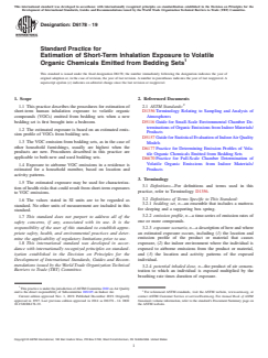 ASTM D6178-19 is a standard published by ASTM International. Its full title is "Standard Practice for Estimation of Short-Term Inhalation Exposure to Volatile Organic Chemicals Emitted from Bedding Sets". This standard covers: SIGNIFICANCE AND USE 5.1 The objective of this practice is to provide procedures for estimation of human inhalation exposure to VOCs emitted from bedding sets in homes. The estimated inhalation exposure can be used as an input for characterization of health risks from short-term VOC exposures. 5.2 The results of exposure estimation for specific raw materials and components, or processes used in manufacturing different bedding sets, can be used to compare their relative impacts on exposures. SCOPE 1.1 This practice describes the procedures for estimation of short-term human inhalation exposure to volatile organic compounds (VOCs) emitted from bedding sets when a new bedding set is first brought into a bedroom. 1.2 The estimated exposure is based on an estimated emission profile of VOCs from bedding sets. 1.3 The VOC emission from bedding sets, as in the case of other household furnishings, usually are highest when the products are new. Procedures described in this practice are applicable to both new and used bedding sets. 1.4 Exposure to airborne VOC emissions in a residence is estimated for a household member, based on location and activity patterns. 1.5 The estimated exposure may be used for characterization of health risks that could result from short-term exposures to VOC emissions. 1.6 The values stated in SI units are to be regarded as standard. No other units of measurement are included in this standard. 1.7 This standard does not purport to address all of the safety concerns, if any, associated with its use. It is the responsibility of the user of this standard to establish appropriate safety, health, and environmental practices and determine the applicability of regulatory limitations prior to use. 1.8 This international standard was developed in accordance with internationally recognized principles on standardization established in the Decision on Principles for the Development of International Standards, Guides and Recommendations issued by the World Trade Organization Technical Barriers to Trade (TBT) Committee.