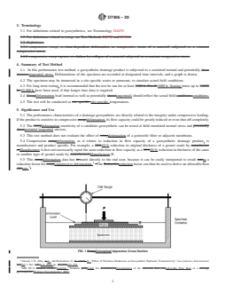 SIGNIFICANCE AND USE 5.1 The performance characteristics of a drainage geosynthetic are directly related to the integrity under compressive loading. If the product is sensitive to compressive deformation, its flow capacity could be greatly reduced or even shut off completely. 5.2 The deformation sensitivity of a candidate geosynthetic can be tested at field-simulated normal stress and potential tangential stresses. 5.3 This test method does not evaluate the effect of deformation of a geotextile filter or adjacent membrane. 5.4 Compression deformation, as it relates to reduction in flow capacity of a geosynthetic drainage product, is manufacturer and product specific. For example, a 10 % reduction in original thickness of a geonet made by Manufacturer A does not necessarily equal the same reduction in flow capacity as a 10 % reduction in thickness of the same or another type of geonet made by Manufacturer B. 5.5 This deformation data has merit directly to the end user, because it can be easily interpreted to result in a reduction factor for compressive deformation.4 The reduction factor can then be used to derive an allowable flow rate.5 SCOPE 1.1 This test method is used to determine the unconfined compressive deformation (consolidation) characteristics of drainage geotextiles, geocomposites, geonets, or any other geosynthetic associated with drainage at a constant temperature, when subjected to a constant compressive stress. 1.2 This test method is intended for use as an unconfined compressive performance deformation test only. For a detailed procedure on how to establish an index test, see EN ISO 25619-1. For performance tests, the specimen shall be subjected to the site-specific liquid, the site-specific stress (normal and potentially a tangential stress on the upper and parallel loading platen), or both. Note 1: Results achieved from unconfined compressive performance deformation testing may differ from testing performed under confined conditions. 1.3 Because of the changing nature of the geosynthetic industry and the wide variety of products already available, this particular test method may have to be slightly modified for unconfined compression deformation testing of some products. 1.4 The values given in SI units are to be considered as the standard. The values given in parentheses are for information only. 1.5 This standard does not purport to address all of the safety concerns, if any, associated with its use. It is the responsibility of the user of this standard to establish appropriate safety, health, and environmental practices and determine the applicability of regulatory limitations prior to use. 1.6 This international standard was developed in accordance with internationally recognized principles on standardization established in the Decision on Principles for the Development of International Standards, Guides and Recommendations issued by the World Trade Organization Technical Barriers to Trade (TBT) Committee.