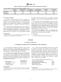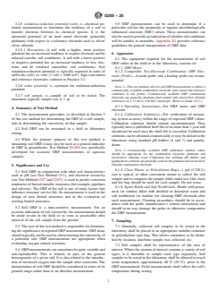 SIGNIFICANCE AND USE 5.1 Soil ORP, in conjunction with other soil characteristics such as pH (see Test Method G51), and electrical resistivity (see Test Methods G57 and G187), is used to predict corrosion tendencies of buried metallic structures (for example, pipelines and culverts). The ORP of the soil is one of many factors that influence structure service life. Its measurement is used in the design of new buried structures and in the evaluation of existing buried structures. 5.2 Soil ORP is a time-sensitive measurement. For an accurate indication of soil corrosivity, the measurement should be made in-situ in the field or as soon as practicable after removal of the soil sample from the ground. 5.3 The user of this test method is responsible for determining the significance of reported ORP measurements. ORP alone should typically not be used in characterizing the corrosivity of a particular soil. ORP measurements are appropriate when evaluating oxygen related reactions. 5.4 ORP measurements can sometimes be quite variable and non-reproducible. This is related, in part, to the general heterogeneity of a given soil. It is also related to the introduction of increased oxygen into the sample after extraction. The interpretation of soil ORP should be considered in terms of its general range rather than as an absolute measurement. 5.5 ORP measurements can be used to determine if a particular soil has the propensity to support microbiologically influenced corrosion (MIC) attack. These measurements can also be used to provide an indication of whether soil conditions will be aerobic or anaerobic. Appendix X1 provides reference guidelines for general interpretation of ORP data. SCOPE 1.1 This test method covers a procedure and related test equipment for measuring oxidation-reduction potential (ORP) of soil samples in-situ or removed from the ground. 1.2 The procedure in Section 9 is appropriate for field and laboratory measurements. 1.3 Accurate measurement of oxidation-reduction potential aids in the analysis of soil corrosivity and its impact on buried metallic structure corrosion rates. 1.4 The values stated in inch-pound units are to be regarded as standard. The values given in parentheses are mathematical conversions to SI units that are provided for information only and are not considered standard. 1.5 This standard does not purport to address all of the safety concerns, if any, associated with its use. It is the responsibility of the user of this standard to establish appropriate safety, health, and environmental practices and determine the applicability of regulatory limitations prior to use. 1.6 This international standard was developed in accordance with internationally recognized principles on standardization established in the Decision on Principles for the Development of International Standards, Guides and Recommendations issued by the World Trade Organization Technical Barriers to Trade (TBT) Committee.