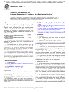 ASTM D4266-17 is a standard published by ASTM International. Its full title is "Standard Test Methods for Precoat Capacity of Powdered Ion-Exchange Resins". This standard covers: SIGNIFICANCE AND USE 4.1 The salt removal capacity of a powdered resin precoat is limited by the capacity of either the anion-exchange resin or the cation-exchange resin contained in it. Applications include condensate polishing in fossil-fueled electric generating plants, as well as condensate polishing, spent fuel pool water treatment, reactor water treatment, and low-level radioactive liquid waste treatment in nuclear-powered electric generating plants. 4.2 By determining the ion-exchange capacity profile of either a cation exchange resin or an anion-exchange resin (capacity expended per unit of time under specific conditions), it is possible to estimate runlength and remaining capacity when treating a liquid of the same makeup. Although they cannot accurately predict performance during condenser leaks, these test methods are useful for determining operating capacities as measured under the test conditions used. 4.3 These test methods may be used to monitor the performance of either powdered anion-exchange resin or powdered cation-exchange resin. The total capacity of either resin depends primarily upon the number density of ion-exchange sites within the resin. The operating capacity is a function of the total capacity, degree of conversion to the desired ionic form when received, and properties of the resin and the system that affect ion exchange kinetics. SCOPE 1.1 These test methods cover the determination of the operating ion-exchange capacity of both powdered cation-exchange resins (hydrogen form) and powdered anion-exchange resins (hydroxide form). These test methods are intended for use in testing new powdered ion-exchange resins when used for the treatment of water. The following two test methods are included: Sections Test Method A—Operating Capacity, Anion-Exchange Resin, Hydroxide Form 7 to 15 Test Method B—Operating Capacity, Cation-Exchange Resin, Hydrogen Form 16 to 24 1.2 The values stated in SI units are to be regarded as the standard. The inch-pound units given in parentheses are for information only. 1.3 This standard does not purport to address all of the safety concerns, if any, associated with its use. It is the responsibility of the user of this standard to establish appropriate safety and health practices and determine the applicability of regulatory limitations prior to use. 1.4 This international standard was developed in accordance with internationally recognized principles on standardization established in the Decision on Principles for the Development of International Standards, Guides and Recommendations issued by the World Trade Organization Technical Barriers to Trade (TBT) Committee.
