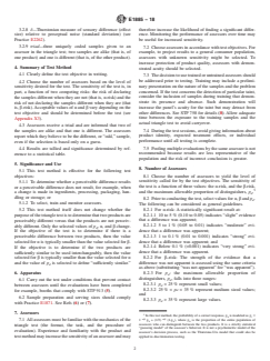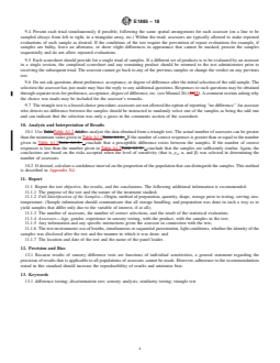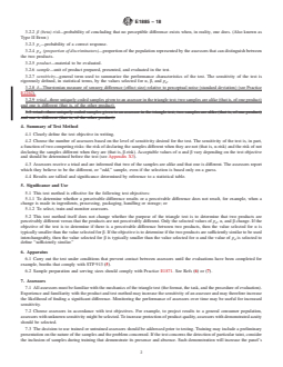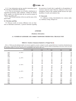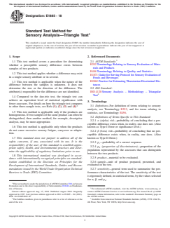 SIGNIFICANCE AND USE 5.1 This test method is effective for the following test objectives: 5.1.1 To determine whether a perceivable difference results or a perceivable difference does not result, for example, when a change is made in ingredients, processing, packaging, handling or storage; or 5.1.2 To select, train and monitor assessors. 5.2 This test method itself does not change whether the purpose of the triangle test is to determine that two products are perceivably different versus that the products are not perceivably different. Only the selected values of pd, α, and β change. If the objective of the test is to determine if there is a perceivable difference between two products, then the value selected for α is typically smaller than the value selected for β. If the objective is to determine if the two products are sufficiently similar to be used interchangeably, then the value selected for β is typically smaller than the value selected for α and the value of pd is selected to define “sufficiently similar.” SCOPE 1.1 This test method covers a procedure for determining whether a perceptible sensory difference exists between samples of two products. 1.2 This test method applies whether a difference may exist in a single sensory attribute or in several. 1.3 This test method is applicable when the nature of the difference between the samples is unknown. It does not determine the size or the direction of the difference. The attribute(s) responsible for the difference are not identified. 1.4 Compared to the duo-trio test, the triangle test can achieve an equivalent level of statistical significance with fewer assessors. For details on how the triangle test compares to other three-sample tests, see Refs (1) , (2), (3) and (4).2 1.5 This test method is applicable only if the products are homogeneous. If two samples of the same product can often be distinguished, then another method, for example, descriptive analysis, may be more appropriate. 1.6 This test method is applicable only when the products do not cause excessive sensory fatigue, carryover or adaptation. 1.7 This standard does not purport to address all of the safety concerns, if any, associated with its use. It is the responsibility of the user of this standard to establish appropriate safety, health, and environmental practices and determine the applicability of regulatory limitations prior to use. 1.8 This international standard was developed in accordance with internationally recognized principles on standardization established in the Decision on Principles for the Development of International Standards, Guides and Recommendations issued by the World Trade Organization Technical Barriers to Trade (TBT) Committee.