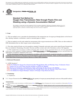 ASTM F3136-22 is a standard published by ASTM International. Its full title is "Standard Test Method for Oxygen Gas Transmission Rate through Plastic Film and Sheeting using a Dynamic Accumulation Method". This standard covers: SIGNIFICANCE AND USE 5.1 The Oxygen Transmission Rate is an important determinant of packaging functionality afforded by packaging materials for a wide variety of packaged products including food, pharmaceuticals and medical devices. In some applications, sufficient oxygen must be allowed to permeate into the package. In others, the oxygen ingress must be minimized to maintain product quality. 5.2 Other ASTM Standard Methods to measure the oxygen transmission rate are described in Test Method D3985 and Test Method F2622. SCOPE 1.1 This test method covers a procedure for determination of the transmission rate of oxygen gas through plastics in the form of film, sheeting, laminates, coextrusions, coated or uncoated papers or fabrics. 1.2 This test method is not the only method for measurement of the oxygen transmission rate (OTR). There are other methods of OTR determination that use other oxygen sensors and procedures. 1.3 The values stated in SI units are to be regarded as standard. Commonly used metric units used to report Oxygen Transmission Rate are included in Terminology, Procedure, Precision and Bias sections and in the Calculation section of the Appendix. 1.4 This standard does not purport to address all of the safety concerns, if any, associated with its use. It is the responsibility of the user of this standard to establish appropriate safety, health, and environmental practices and determine the applicability of regulatory limitations prior to use. 1.5 This international standard was developed in accordance with internationally recognized principles on standardization established in the Decision on Principles for the Development of International Standards, Guides and Recommendations issued by the World Trade Organization Technical Barriers to Trade (TBT) Committee.