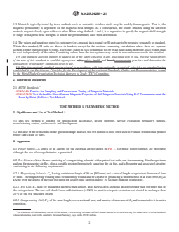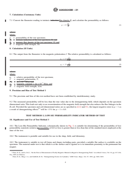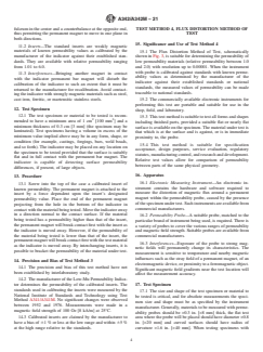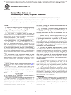 SIGNIFICANCE AND USE 3.1 This test method is suitable for specification acceptance, design purposes, service evaluation, regulatory statutes, manufacturing control, and research and development. 3.2 Because of the restrictions on the specimen shape and size, this test method is most often used to evaluate semifinished product before fabrication of parts. SCOPE 1.1 These test methods cover four procedures for determination of the permeability [relative permeability]2 of materials having a relative permeability not exceeding 6.0. 1.2 The test methods covered are as follows: 1.2.1 Test Method 1—Fluxmetric Method is suitable for materials with relative permeabilities between 1.0 and 4.0. This method permits the user to select the magnetic field strength at which the permeability is to be measured. 1.2.2 Test Method 2—Permeability of Paramagnetic Materials has been eliminated as an acceptable method of test. 1.2.3 Test Method 3—Low Mu Permeability Indicator is suitable for measuring the permeability of a material as “less than” or “greater than” that of calibrated standard inserts with relative permeabilities between 1.01 and 6.0, as designated for use in a Low-Mu Permeability Indicator.3 In this method, a small volume of specimen is subjected to a local magnetic field that varies in magnitude and direction, so it is not possible to specify the magnetic field strength at which the measurement is made. 1.2.4 Test Method 4—Flux Distortion is suitable for materials with relative permeabilities between 1.0 and 2.0. In this method, a small volume of specimen is subjected to a local magnetic field that varies in magnitude and direction, so it is not possible to specify the magnetic field strength at which the measurement is made.4 1.2.5 Test Method 5—Vibrating Sample Magnetometry is suitable for materials with relative permeabilities between 1.0 and 4.0. This test method permits the user to select the magnetic field strength at which the permeability is to be measured. 1.3 Materials typically tested by these methods such as austenitic stainless steels may be weakly ferromagnetic. That is, the magnetic permeability is dependent on the magnetic field strength. As a consequence, the results obtained using the different methods may not closely agree with each other. When using Methods 1 and 5, it is imperative to specify the magnetic field strength or range of magnetic field strengths at which the permeabilities have been determined. 1.4 The values and equations stated in customary (cgs-emu and inch-pound) or SI units are to be regarded separately as standard. Within this standard, SI units are shown in brackets except for the sections concerning calculations where there are separate sections for the respective unit systems. The values stated in each system may not be exact equivalents; therefore, each system shall be used independently of the other. Combining values from the two systems may result in nonconformance with this standard. 1.5 This standard does not purport to address all of the safety concerns, if any, associated with its use. It is the responsibility of the user of this standard to establish appropriate safety, health, and environmental practices and determine the applicability of regulatory limitations prior to use. 1.6 This international standard was developed in accordance with internationally recognized principles on standardization established in the Decision on Principles for the Development of International Standards, Guides and Recommendations issued by the World Trade Organization Technical Barriers to Trade (TBT) Committee.