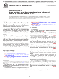 ASTM E2819-11(2021) is a standard published by ASTM International. Its full title is "Standard Practice for Single- and Multi-Level Continuous Sampling of a Stream of Product by Attributes Indexed by AQL". This standard covers: ABSTRACT This practice establishes tables and procedures for applying five different types of continuous sampling plans for inspection by attributes using MIL-STD-1235B as a basis for sampling a steady stream of lots indexed by AQL. This practice represents a conversion of MIL-STD1235B to an ASTM-supported standard. SIGNIFICANCE AND USE 4.1 The reason for preserving military sampling standards is that many organizations throughout the world still use these standards in their current form. MIL-STD-1235B is no longer supported by the U.S. Department of Defense as of the mid-1990s and is out of print, but does exist in the public domain. This practice represents a conversion of MIL-STD-1235B to an ASTM-supported standard. 4.2 This practice provides the tables and procedures for applying five different types of continuous sampling plans for inspection by attributes. These continuous sampling plans are discussed in Sections 6 – 10 of this practice and each section includes information on: (1) Initiation of 100 % inspection in use. (2) Requirements on when to switch to sampling inspection. (3) Conditions warranting a return to 100 % inspection. (4) When a change in Code Letter, if desired, can be made. (5) What to do when the checking inspector finds a defect that was originally found conforming by the screening inspector(s), that is, ineffective screening. (6) Situations where a defect is found before the switch to 100 % inspection causing excessive periods of 100 % inspection so action must be taken, that is, long periods of screening. 4.2.1 Section 6 (Section 2 in MIL-STD-1235B) describes specific procedures and applications of the CSP-1 sampling plans – a single-level continuous sampling procedure which provides for alternating between sequences of 100 % inspection and sampling inspection. 4.2.2 Section 7 (Section 3 in MIL-STD-1235B) describes specific procedures and applications of the CSP-F sampling plans – a variation of the CSP-1 plans in that CSP-F plans are applied to a relatively short run of product, thereby permitting smaller clearance numbers to be used. 4.2.3 Section 8 (Section 4 in MIL-STD-1235B) describes specific procedures and applications of the CSP-2 sampling plans – a modification of CSP-1 in that 100 % inspection resumes only after a prescribed number of def... SCOPE 1.1 This practice establishes tables and procedures for applying five different types of continuous sampling plans for inspection by attributes using MIL-STD-1235B as a basis for sampling a steady stream of lots indexed by AQL. 1.2 This practice provides the sampling plans of MIL-STD-1235B in ASTM format for use by ASTM committees and others. It recognizes the continuing usage of MIL-STD-1235B in industries supported by ASTM. Most of the original text in MIL-STD-1235B is preserved in Sections 6 – 10 of this practice. 1.3 This standard does not purport to address all of the safety concerns, if any, associated with its use. It is the responsibility of the user of this standard to establish appropriate safety, health, and environmental practices and determine the applicability of regulatory limitations prior to use. 1.4 This international standard was developed in accordance with internationally recognized principles on standardization established in the Decision on Principles for the Development of International Standards, Guides and Recommendations issued by the World Trade Organization Technical Barriers to Trade (TBT) Committee.