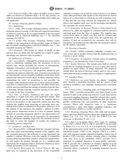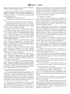 ABSTRACT This practice establishes tables and procedures for applying five different types of continuous sampling plans for inspection by attributes using MIL-STD-1235B as a basis for sampling a steady stream of lots indexed by AQL. This practice represents a conversion of MIL-STD1235B to an ASTM-supported standard. SIGNIFICANCE AND USE 4.1 The reason for preserving military sampling standards is that many organizations throughout the world still use these standards in their current form. MIL-STD-1235B is no longer supported by the U.S. Department of Defense as of the mid-1990s and is out of print, but does exist in the public domain. This practice represents a conversion of MIL-STD-1235B to an ASTM-supported standard. 4.2 This practice provides the tables and procedures for applying five different types of continuous sampling plans for inspection by attributes. These continuous sampling plans are discussed in Sections 6 – 10 of this practice and each section includes information on: (1) Initiation of 100 % inspection in use. (2) Requirements on when to switch to sampling inspection. (3) Conditions warranting a return to 100 % inspection. (4) When a change in Code Letter, if desired, can be made. (5) What to do when the checking inspector finds a defect that was originally found conforming by the screening inspector(s), that is, ineffective screening. (6) Situations where a defect is found before the switch to 100 % inspection causing excessive periods of 100 % inspection so action must be taken, that is, long periods of screening. 4.2.1 Section 6 (Section 2 in MIL-STD-1235B) describes specific procedures and applications of the CSP-1 sampling plans – a single-level continuous sampling procedure which provides for alternating between sequences of 100 % inspection and sampling inspection. 4.2.2 Section 7 (Section 3 in MIL-STD-1235B) describes specific procedures and applications of the CSP-F sampling plans – a variation of the CSP-1 plans in that CSP-F plans are applied to a relatively short run of product, thereby permitting smaller clearance numbers to be used. 4.2.3 Section 8 (Section 4 in MIL-STD-1235B) describes specific procedures and applications of the CSP-2 sampling plans – a modification of CSP-1 in that 100 % inspection resumes only after a prescribed number of def... SCOPE 1.1 This practice establishes tables and procedures for applying five different types of continuous sampling plans for inspection by attributes using MIL-STD-1235B as a basis for sampling a steady stream of lots indexed by AQL. 1.2 This practice provides the sampling plans of MIL-STD-1235B in ASTM format for use by ASTM committees and others. It recognizes the continuing usage of MIL-STD-1235B in industries supported by ASTM. Most of the original text in MIL-STD-1235B is preserved in Sections 6 – 10 of this practice. 1.3 This standard does not purport to address all of the safety concerns, if any, associated with its use. It is the responsibility of the user of this standard to establish appropriate safety, health, and environmental practices and determine the applicability of regulatory limitations prior to use. 1.4 This international standard was developed in accordance with internationally recognized principles on standardization established in the Decision on Principles for the Development of International Standards, Guides and Recommendations issued by the World Trade Organization Technical Barriers to Trade (TBT) Committee.