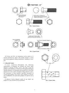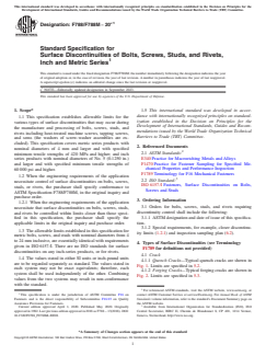 ABSTRACT This specification establishes allowable limits for the various types of surface discontinuities that may occur during the manufacture and processing of bolts, screws, and studs, including heat-treated machine screws, tapping screws, and sems. Types of surface discontinuities are: crack; burst; seam; fold; thread lap; void; tool marks; and gouge and nick. These surface discontinuities shall be inspected in accordance with the specified requirements. SCOPE 1.1 This specification establishes allowable limits for the various types of surface discontinuities that may occur during the manufacture and processing of bolts, screws, studs, and rivets including heat-treated machine screws, tapping screws, and sems (the washers of screw-washer assemblies are excluded). This specification covers metric series products with nominal diameters of 4 mm and larger and with specified minimum tensile strengths of 420 MPa and higher; and inch series products with nominal diameters of No. 5 (0.1250 in.) and larger and with specified minimum tensile strengths of 60 000 psi and higher. 1.2 When the engineering requirements of the application necessitate control of surface discontinuities on bolts, screws, studs, or rivets, the purchaser shall specify conformance to ASTM Specification F788/F788M, in the original inquiry and purchase order. 1.2.1 When the engineering requirements of the application necessitate that surface discontinuities on bolts, screws, studs, and rivets be controlled within limits closer than those specified in this specification, the purchaser shall specify the applicable limits in the original inquiry and purchase order. 1.3 The allowable limits established in this specification for metric bolts, screws, and studs with nominal diameters from 4 to 24 mm inclusive, are essentially identical with requirements given in ISO 6157/I. There are no ISO standards for surface discontinuities on any inch-series products, or for rivets. 1.4 The values stated in either SI units or inch-pound units are to be regarded separately as standard. The values stated in each system may not be exact equivalents; therefore, each system shall be used independently of the other. Combining values from the two systems may result in non-conformance with the standard. 1.5 This international standard was developed in accordance with internationally recognized principles on standardization established in the Decision on Principles for the Development of International Standards, Guides and Recommendations issued by the World Trade Organization Technical Barriers to Trade (TBT) Committee.