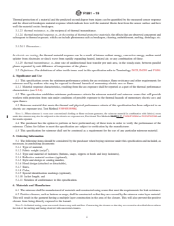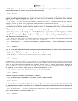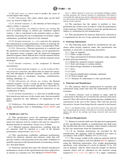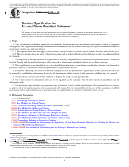 ABSTRACT This specification establishes applicable test methods, minimum physical and thermal performance criteria, a suggested sizing guide, and suggested purchasing information for rainwear for use by workers who may be exposed to thermal hazards of momentary electric arcs and open flames. It does not however apply to electrical contact hazards or electric shock hazards involved with electric arcs nor to flash fire hazards such as industrial hydrocarbon flash fires or other petrochemical flash fire hazards. The rainwear shall be manufactured of materials and constructed using seams that meet the requirements for leak resistance and shall meet the physical requirements of this specification initially as manufactured and after five cleanings. The specimen shall be subjected to tests to determine conformance to the following requirements: flame resistance, tear strength resistance, waterproofness, electric arc resistance, material average weight, arc rating, arc thermal performance value, breakopen threshold energy, heat attenuation factor, and melting and dripping. The material response characteristics for rainwear material, including afterflame time, breakopen, charring, dripping, electric arc ignition, embrittlement, melting, and shrinkage, shall be reported for two typical exposures at least equal to the arc rating and also for two typical exposures at least two times the arc rating. SCOPE 1.1 This specification establishes applicable test methods, minimum physical and thermal performance criteria, a suggested sizing guide, and suggested purchasing information for rainwear for use by workers who may be exposed to thermal hazards of momentary electric arcs and open flames. 1.1.1 This specification does not apply to the electrical contact hazards or electric shock hazards involved with electric arcs. 1.1.2 This specification does not apply to flash fire hazards such as industrial hydrocarbon flash fires or other petrochemical flash fire hazards. 1.2 The objective of this specification is to prescribe fit, function and performance criteria for rainwear that meets a minimum level of thermal and physical performance when exposed to a laboratory–simulated electric arc or flame exposure. 1.3 This specification is not intended to serve as a detailed manufacturing or purchasing specification, but can be referenced in purchase contracts to ensure that minimum performance requirements are met. 1.4 Controlled laboratory tests used to determine compliance with the performance requirements of this specification shall not be deemed as establishing performance levels for all situations to which wearers of this protective clothing may be exposed. 1.5 The in-service care and use of this rainwear is beyond the scope of this specification. 1.6 The values stated in inch-pound units are to be regarded as the standard. The SI units shown in parentheses are for information only. 1.7 The following safety hazards caveat pertains only to Sections 7 and 9, of this specification: This standard does not purport to address all of the safety concerns, if any, associated with its use. It is the responsibility of the user of this standard to establish appropriate safety and health practices and determine the applicability of regulatory limitations prior to use.