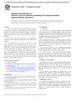 SIGNIFICANCE AND USE 5.1 Particles in insulating oil can have a detrimental effect on the dielectric properties of the fluid, depending on the size, concentration, and nature of the particles. The source of these particles can be external contaminants, oil degradation by-products, or internal materials such as metals, carbon, or cellulose fibers. 5.2 Particle counts provide a general degree of contamination level and may be useful in assessing the condition of specific types of electrical equipment. Particle counts can also be used to determine filtering effectiveness when processing oil. 5.3 If more specific knowledge of the nature of the particles is needed, other tests such as metals analysis or fiber identification and counting must be performed. SCOPE 1.1 This test method covers the determination of particle concentration and particle size distribution in mineral insulating oil. It is suitable for testing oils having a viscosity of 6 mm2/s to 20 mm2/s at 40 °C. The test method is specific to liquid automatic particle analyzers that use the light extinction principle. 1.2 The values stated in SI units are to be regarded as standard. No other units of measurement are included in this standard. 1.3 This standard does not purport to address all of the safety concerns, if any, associated with its use. It is the responsibility of the user of this standard to establish appropriate safety, health, and environmental practices and determine the applicability of regulatory limitations prior to use. 1.4 This international standard was developed in accordance with internationally recognized principles on standardization established in the Decision on Principles for the Development of International Standards, Guides and Recommendations issued by the World Trade Organization Technical Barriers to Trade (TBT) Committee.