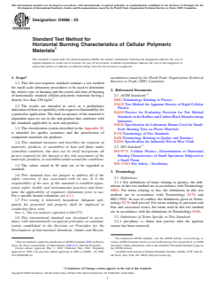 ASTM D4986-22 is a standard published by ASTM International. Its full title is "Standard Test Method for Horizontal Burning Characteristics of Cellular Polymeric Materials". This standard covers: SIGNIFICANCE AND USE 5.1 This test method provides a means of measuring the time and extent of burning for cellular polymeric materials. It also provides a means of measuring burning rates for materials that continue to burn past the specified gage marks. 5.2 This test method provides a means of comparing the burning characteristics of materials of like thickness density, cell size, and skin irregularities, including the effect of falling particles of cellular polymeric materials. It is suitable for quality control, specification acceptance, and for research and development. Examples include filled or reinforced, rigid or flexible, or cut or formed materials 5.3 In this test method, the specimens are subjected to one or more specific sets of laboratory fire test exposure conditions. If different test conditions are substituted or if the anticipated end-use conditions are changed, it is not always possible from this test method to predict changes in the performance characteristics measured. Therefore, the results are strictly valid only for the fire test exposure conditions described in this procedure. 5.4 This test method is not intended to be a criterion for fire hazard. The fire hazard created by materials depends upon the form and end use of the material. Assessment of fire hazard includes, but is not limited to, many factors such as flame spread, burning rate, ease of ignition, fuel contribution, heat evolution, products of combustion, and others. SCOPE 1.1 This fire-test-response standard contains a test method for small-scale laboratory procedures to be used to determine the relative rate of burning and the extent and time of burning of horizontally oriented cellular polymeric materials having a density less than 250 kg/m3. 1.2 The results are intended to serve as a preliminary indication of their acceptability with respect to flammability for a particular application. The final acceptance of the material is dependent upon its use in the end-product that conforms with the standards applicable to such end-product. 1.3 The classification system described in the Appendix X1 is intended for quality assurance and the preselection of component materials for products. 1.4 This standard measures and describes the response of materials, products, or assemblies to heat and flame under controlled conditions, but does not by itself incorporate all factors required for fire hazard or fire risk assessment of the materials, products, or assemblies under actual fire conditions. 1.5 The values stated in SI units are to be regarded as standard. 1.6 This standard does not purport to address all of the safety concerns, if any, associated with its use. It is the responsibility of the user of this standard to establish appropriate safety, health, and environmental practices and determine the applicability of regulatory limitations prior to use. For a specific hazard statement, see 6.1.1. 1.7 Fire testing is inherently hazardous. Adequate safeguards for personnel and property shall be employed in conducting these tests. Note 1: This test method is equivalent to ISO 9772. 1.8 This international standard was developed in accordance with internationally recognized principles on standardization established in the Decision on Principles for the Development of International Standards, Guides and Recommendations issued by the World Trade Organization Technical Barriers to Trade (TBT) Committee.