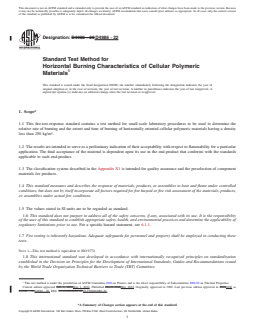 SIGNIFICANCE AND USE 5.1 This test method provides a means of measuring the time and extent of burning for cellular polymeric materials. It also provides a means of measuring burning rates for materials that continue to burn past the specified gage marks. 5.2 This test method provides a means of comparing the burning characteristics of materials of like thickness density, cell size, and skin irregularities, including the effect of falling particles of cellular polymeric materials. It is suitable for quality control, specification acceptance, and for research and development. Examples include filled or reinforced, rigid or flexible, or cut or formed materials 5.3 In this test method, the specimens are subjected to one or more specific sets of laboratory fire test exposure conditions. If different test conditions are substituted or if the anticipated end-use conditions are changed, it is not always possible from this test method to predict changes in the performance characteristics measured. Therefore, the results are strictly valid only for the fire test exposure conditions described in this procedure. 5.4 This test method is not intended to be a criterion for fire hazard. The fire hazard created by materials depends upon the form and end use of the material. Assessment of fire hazard includes, but is not limited to, many factors such as flame spread, burning rate, ease of ignition, fuel contribution, heat evolution, products of combustion, and others. SCOPE 1.1 This fire-test-response standard contains a test method for small-scale laboratory procedures to be used to determine the relative rate of burning and the extent and time of burning of horizontally oriented cellular polymeric materials having a density less than 250 kg/m3. 1.2 The results are intended to serve as a preliminary indication of their acceptability with respect to flammability for a particular application. The final acceptance of the material is dependent upon its use in the end-product that conforms with the standards applicable to such end-product. 1.3 The classification system described in the Appendix X1 is intended for quality assurance and the preselection of component materials for products. 1.4 This standard measures and describes the response of materials, products, or assemblies to heat and flame under controlled conditions, but does not by itself incorporate all factors required for fire hazard or fire risk assessment of the materials, products, or assemblies under actual fire conditions. 1.5 The values stated in SI units are to be regarded as standard. 1.6 This standard does not purport to address all of the safety concerns, if any, associated with its use. It is the responsibility of the user of this standard to establish appropriate safety, health, and environmental practices and determine the applicability of regulatory limitations prior to use. For a specific hazard statement, see 6.1.1. 1.7 Fire testing is inherently hazardous. Adequate safeguards for personnel and property shall be employed in conducting these tests. Note 1: This test method is equivalent to ISO 9772. 1.8 This international standard was developed in accordance with internationally recognized principles on standardization established in the Decision on Principles for the Development of International Standards, Guides and Recommendations issued by the World Trade Organization Technical Barriers to Trade (TBT) Committee.