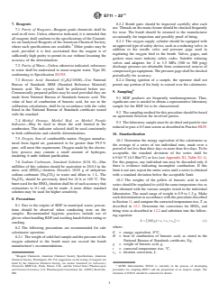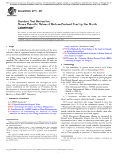 ASTM E711-23e1 – Standard Test Method for Gross Calorific Value of Refuse-Derived Fuel by the Bomb Calorimeter specifies a standardized procedure for determining the gross calorific value, or heat of combustion, of solid forms of refuse-derived fuel (RDF) using a bomb calorimeter. The calorific value provides a direct measurement of the energy available from a fuel, essential for evaluating its commercial worth and supporting contractual agreements between RDF producers and users. This ASTM standard is intended for consistent, accurate assessment across laboratories, using SI units as the primary measurement system and ensuring international compatibility through adherence to the World Trade Organization Technical Barriers to Trade (TBT) principles.