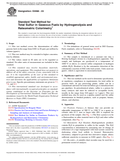 ASTM D4468-23 is a standard published by ASTM International. Its full title is "Standard Test Method for Total Sulfur in Gaseous Fuels by Hydrogenolysis and<brk/> Rateometric Colorimetry". This standard covers: SIGNIFICANCE AND USE 5.1 This test method can be used to determine specification, or regulatory compliance to requirements, for total sulfur in gaseous fuels. In gas processing plants, sulfur can be a contaminant and must be removed before gas is introduced into gas pipelines. In petrochemical plants, sulfur is a poison for many catalysts and must be reduced to acceptable levels, usually in the range from 0.01 ppm/v to 1 ppm/v. This test method may also be used as a quality-control tool for sulfur determination in finished products, such as propane, butane, ethane, and ethylene. SCOPE 1.1 This test method covers the determination of sulfur gaseous fuels in the range from 0.001 to 20 parts per million by volume (ppm/v). 1.2 This test method may be extended to higher concentration by dilution. 1.3 The values stated in SI units are to be regarded as standard. No other units of measurement are included in this standard. 1.4 This standard may involve hazardous materials, operations, and equipment. This standard does not purport to address all of the safety concerns, if any, associated with its use. It is the responsibility of the user of this standard to establish appropriate safety, health, and environmental practices and determine the applicability of regulatory limitations prior to use. Specific precautionary statements are given in 7.7, 7.8, and 8.3. 1.5 This international standard was developed in accordance with internationally recognized principles on standardization established in the Decision on Principles for the Development of International Standards, Guides and Recommendations issued by the World Trade Organization Technical Barriers to Trade (TBT) Committee.