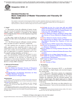 ASTM D2162-21 is the standard practice for the basic calibration of master viscometers and viscosity oil standards. Developed by ASTM International, this standard outlines procedures for calibrating master viscometers and establishing viscosity oil standards, which are then used for the calibration of routine viscometers. The standard covers calibration across a temperature range of 15 °C to 100 °C, using values stated in SI units. The key application of this practice is to ensure precise and traceable measurement of kinematic viscosity in transparent and opaque liquids, especially petroleum products and lubricants.