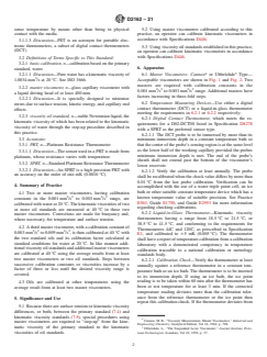 SIGNIFICANCE AND USE 5.1 Because there are surface tension or kinematic viscosity differences, or both, between the primary standard (7.4) and kinematic viscosity standards (7.5), special procedures using master viscometers are required to “step-up” from the kinematic viscosity of the primary standard to the kinematic viscosities of oil standards. 5.2 Using master viscometers calibrated according to this practice, an operator can calibrate kinematic viscometers in accordance with Specifications D446. 5.3 Using viscosity oil standards established in this practice, an operator can calibrate kinematic viscometers in accordance with Specifications D446. SCOPE 1.1 This practice covers the calibration of master viscometers and viscosity oil standards, both of which may be used to calibrate routine viscometers as described in Test Method D445 and Specifications D446 over the temperature range from 15 °C to 100 °C. 1.2 The values stated in SI units are to be regarded as standard. No other units of measurement are included in this standard. 1.2.1 The SI-based units for calibration constants and kinematic viscosities are mm2/s2 and mm 2/s, respectively. 1.3 This standard does not purport to address all of the safety concerns, if any, associated with its use. It is the responsibility of the user of this standard to establish appropriate safety, health, and environmental practices and determine the applicability of regulatory limitations prior to use. For specific warning statements, see Section 7. 1.4 This international standard was developed in accordance with internationally recognized principles on standardization established in the Decision on Principles for the Development of International Standards, Guides and Recommendations issued by the World Trade Organization Technical Barriers to Trade (TBT) Committee.