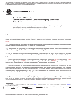 SIGNIFICANCE AND USE 5.1 The prepreg volatiles content, matrix content, reinforcement content, and filler content of composite prepreg materials are used to control material manufacture and subsequent fabrication processes, and are key parameters in the specification and production of such materials, as well as in the fabrication of products made with such materials. 5.2 The extraction products resulting from this test method (the extract, the residue, or both) can be analyzed to assess chemical composition and degree of purity. SCOPE 1.1 This test method covers a Soxhlet extraction procedure to determine the matrix content, reinforcement content, and filler content of composite material prepreg. Volatiles content, if appropriate, and required, is determined by means of Test Method D3530. 1.1.1 The reinforcement and filler must be substantially insoluble in the selected extraction reagent and any filler must be capable of being separated from the reinforcement by filtering the extraction residue. 1.1.2 Reinforcement and filler content test results are total reinforcement content and total filler content; hybrid material systems with more than one type of either reinforcement or filler cannot be distinguished. 1.2 This test method focuses on thermosetting matrix material systems for which the matrix may be extracted by an organic solvent. However, other, unspecified, reagents may be used with this test method to extract other matrix material types for the same purposes. 1.3 Alternate techniques for determining matrix and reinforcement content include Test Methods D3171 (matrix digestion), D2584 (matrix burn-off/ignition), and D3529 (matrix dissolution and ignition loss). Test Method D2584 is preferred for reinforcement materials, such as glass, quartz, or silica, that are unaffected by high-temperature environments. 1.4 The technical content of this standard has been stable since 1997 without significant objection from its stakeholders. As there is limited technical support for the maintenance of this standard, changes since that date have been limited to items required to retain consistency with other ASTM D30 Committee standards. The standard therefore should not be considered to include any significant changes in approach and practice since 1997. Future maintenance of the standard will only be in response to specific requests and performed only as technical support allows. 1.5 The values stated in SI units are to be regarded as standard. No other units of measurement are included in this standard. 1.6 This standard does not purport to address all of the safety concerns, if any, associated with its use. It is the responsibility of the user of this standard to establish appropriate safety, health, and environmental practices and determine the applicability of regulatory limitations prior to use. Specific precautionary statements are given in Section 9 and 7.2.3 and 8.2.1. 1.7 This international standard was developed in accordance with internationally recognized principles on standardization established in the Decision on Principles for the Development of International Standards, Guides and Recommendations issued by the World Trade Organization Technical Barriers to Trade (TBT) Committee.