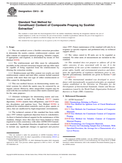 ASTM C613-23 is a standard published by ASTM International. Its full title is "Standard Test Method for Constituent Content of Composite Prepreg by Soxhlet Extraction". This standard covers: SIGNIFICANCE AND USE 5.1 The prepreg volatiles content, matrix content, reinforcement content, and filler content of composite prepreg materials are used to control material manufacture and subsequent fabrication processes, and are key parameters in the specification and production of such materials, as well as in the fabrication of products made with such materials. 5.2 The extraction products resulting from this test method (the extract, the residue, or both) can be analyzed to assess chemical composition and degree of purity. SCOPE 1.1 This test method covers a Soxhlet extraction procedure to determine the matrix content, reinforcement content, and filler content of composite material prepreg. Volatiles content, if appropriate, and required, is determined by means of Test Method D3530. 1.1.1 The reinforcement and filler must be substantially insoluble in the selected extraction reagent and any filler must be capable of being separated from the reinforcement by filtering the extraction residue. 1.1.2 Reinforcement and filler content test results are total reinforcement content and total filler content; hybrid material systems with more than one type of either reinforcement or filler cannot be distinguished. 1.2 This test method focuses on thermosetting matrix material systems for which the matrix may be extracted by an organic solvent. However, other, unspecified, reagents may be used with this test method to extract other matrix material types for the same purposes. 1.3 Alternate techniques for determining matrix and reinforcement content include Test Methods D3171 (matrix digestion), D2584 (matrix burn-off/ignition), and D3529 (matrix dissolution and ignition loss). Test Method D2584 is preferred for reinforcement materials, such as glass, quartz, or silica, that are unaffected by high-temperature environments. 1.4 The technical content of this standard has been stable since 1997 without significant objection from its stakeholders. As there is limited technical support for the maintenance of this standard, changes since that date have been limited to items required to retain consistency with other ASTM D30 Committee standards. The standard therefore should not be considered to include any significant changes in approach and practice since 1997. Future maintenance of the standard will only be in response to specific requests and performed only as technical support allows. 1.5 The values stated in SI units are to be regarded as standard. No other units of measurement are included in this standard. 1.6 This standard does not purport to address all of the safety concerns, if any, associated with its use. It is the responsibility of the user of this standard to establish appropriate safety, health, and environmental practices and determine the applicability of regulatory limitations prior to use. Specific precautionary statements are given in Section 9 and 7.2.3 and 8.2.1. 1.7 This international standard was developed in accordance with internationally recognized principles on standardization established in the Decision on Principles for the Development of International Standards, Guides and Recommendations issued by the World Trade Organization Technical Barriers to Trade (TBT) Committee.