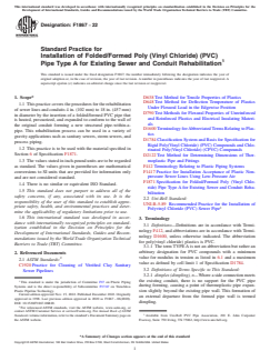 ASTM F1867-22 is a standard published by ASTM International. Its full title is "Standard Practice for Installation of Folded/Formed Poly (Vinyl Chloride) (PVC) Pipe Type A for Existing Sewer and Conduit Rehabilitation". This standard covers: SIGNIFICANCE AND USE 4.1 This practice is for use by designers, and specifies regulatory agencies, owners, and inspection organizations involved in the rehabilitation of non-pressure sewers and conduits. Modifications may be required, depending on specific job conditions, to establish a project specification. The manufacturer of the product should be consulted for design and installation information. Industrial waste disposal lines should be installed only with the specific approval of the cognizant code authority, since chemicals not commonly found in drains and sewers and temperatures in excess of 140 °F (60 °C) may be encountered. SCOPE 1.1 This practice covers the procedures for the rehabilitation of sewer lines and conduits 4 in. (102 mm) to 18 in. (457 mm) in diameter by the insertion of a folded/formed PVC pipe that is heated, pressurized, and expanded to conform to the wall of the original conduit forming a new structural pipe-within-a-pipe. This rehabilitation process can be used in a variety of gravity applications such as sanitary sewers, storm sewers, and process piping. 1.2 This practice is to be used with the material specified in Section 6 of Specification F1871. 1.3 The values stated in inch-pound units are to be regarded as standard. The values given in parentheses are mathematical conversions to SI units that are provided for information only and are not considered standard. 1.4 There is no similar or equivalent ISO Standard. 1.5 This standard does not purport to address all of the safety concerns, if any, associated with its use. It is the responsibility of the user of this standard to establish appropriate safety, health, and environmental practices and determine the applicability of regulatory limitations prior to use. 1.6 This international standard was developed in accordance with internationally recognized principles on standardization established in the Decision on Principles for the Development of International Standards, Guides and Recommendations issued by the World Trade Organization Technical Barriers to Trade (TBT) Committee.